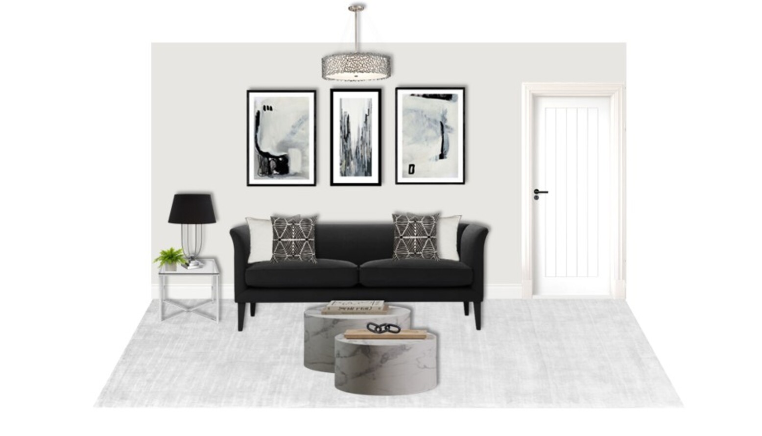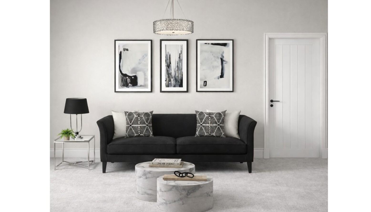 The living room showcases a harmonious blend of comfort and contemporary design. The centerpiece is a Fingal 3 Seat Sofa upholstered in Arctic Seal Easy Cotton, adorned with Bosie Ozella Black and White Square Embroidered Cushions for a pop of graphic detail.