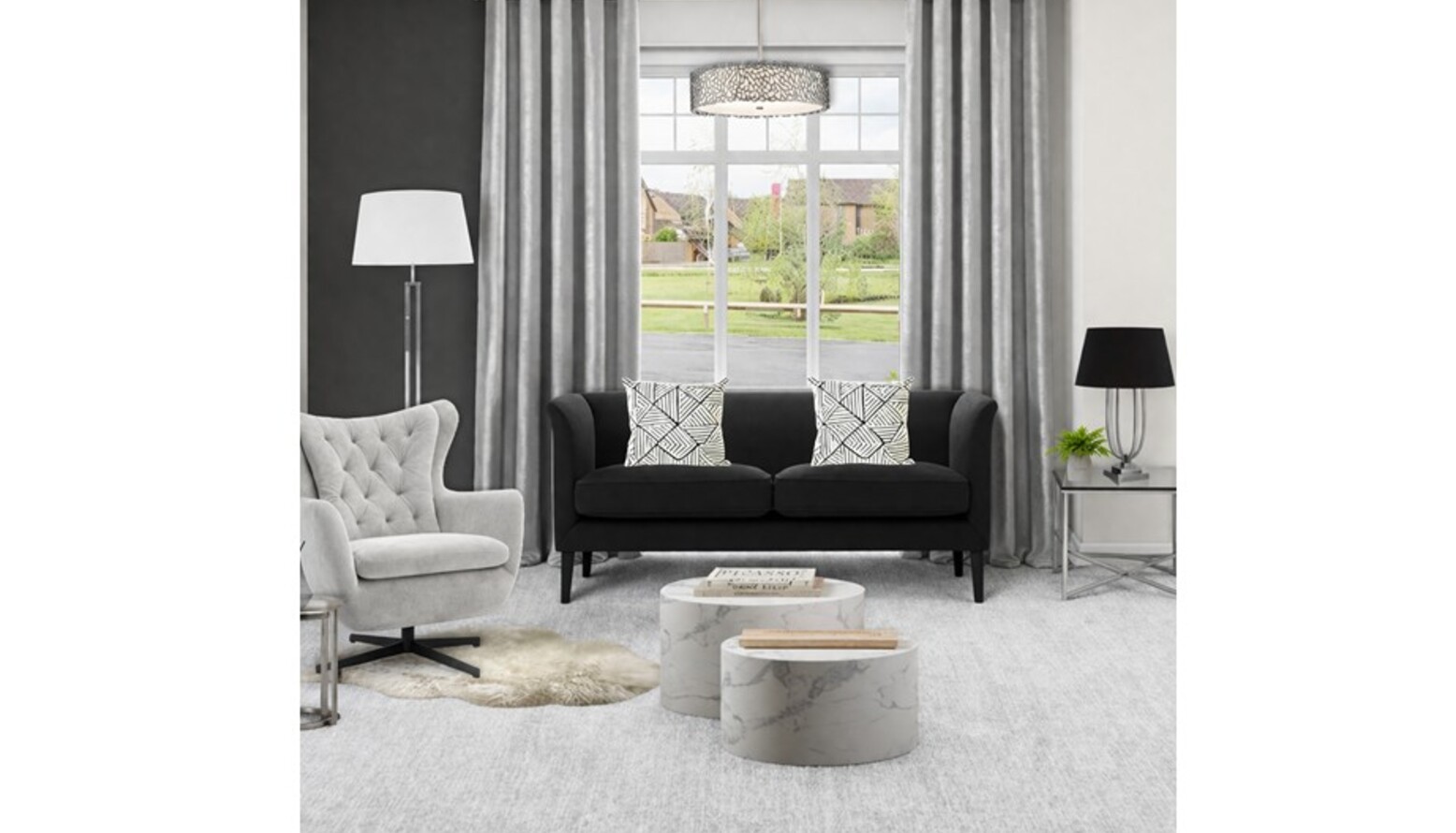 To enhance the ambiance, a Large Paradise Potted Palm brings a touch of nature, complementing the Auckland Luxury Faux Sheepskin area rug in soft white. The inclusion of a Cross Square Metal Side Table with a Glass Top adds a sleek touch, while a Fara White Vase introduces elegance to the setting.