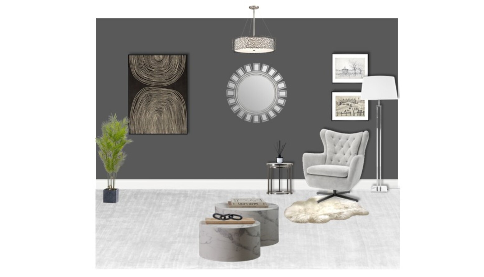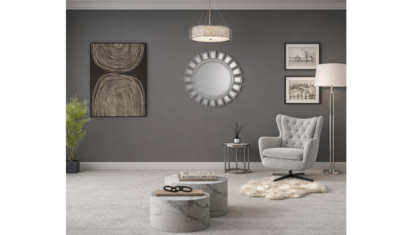Decorative elements include an Inti Silver Wall Mirror that adds depth, and various framed artworks, such as Minimal Black 1 and Decoy I, which provide visual interest on the walls.