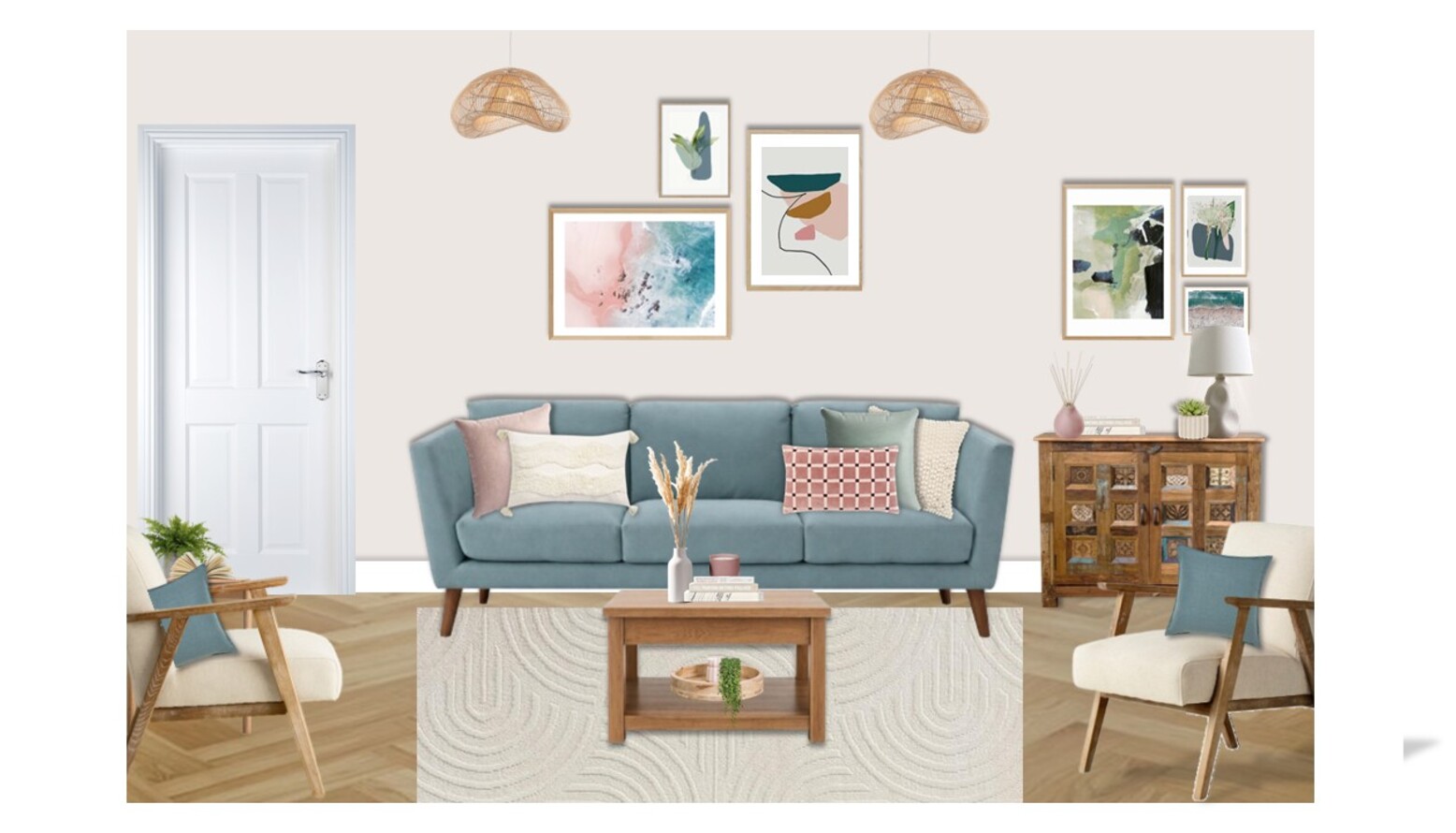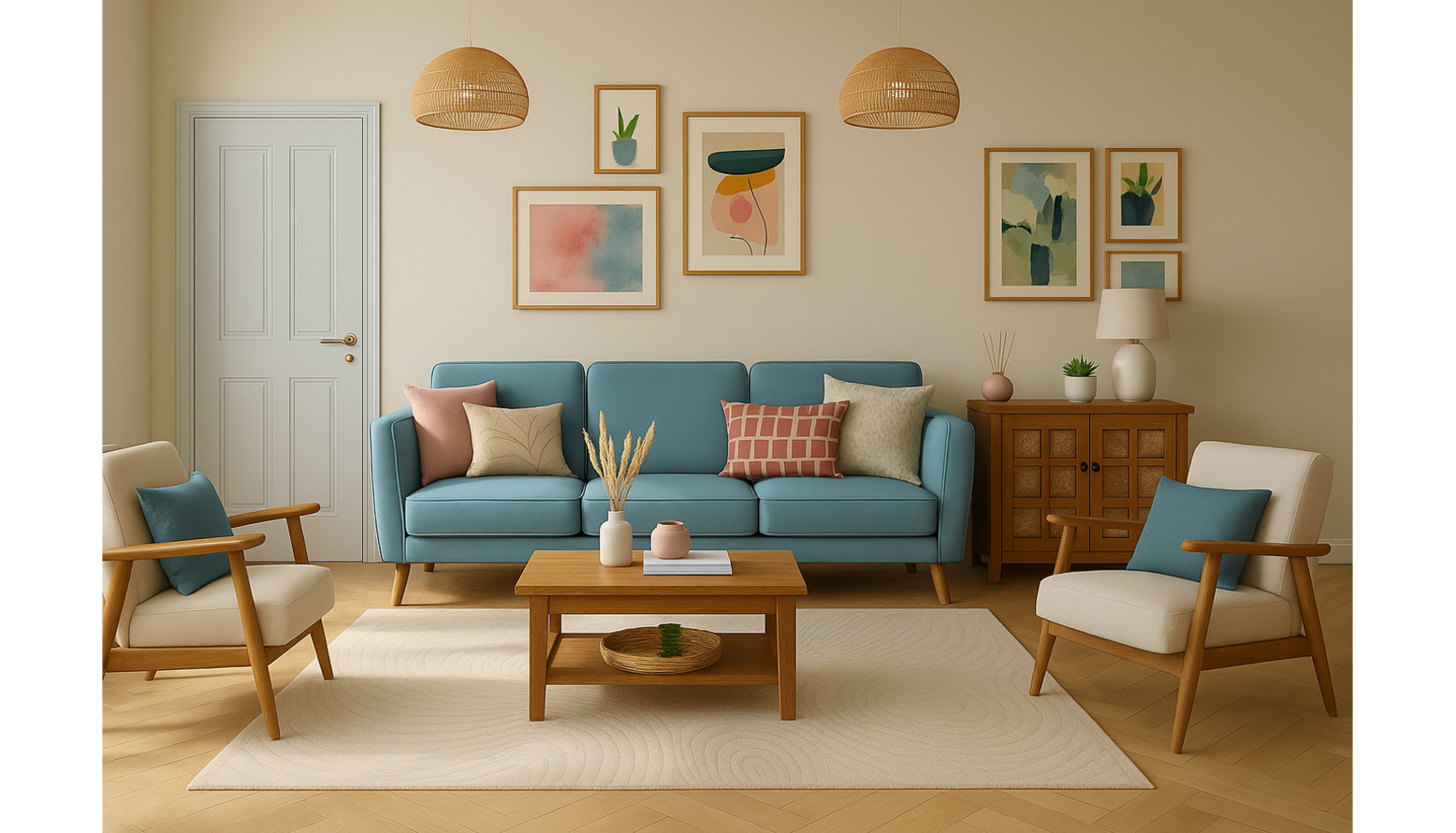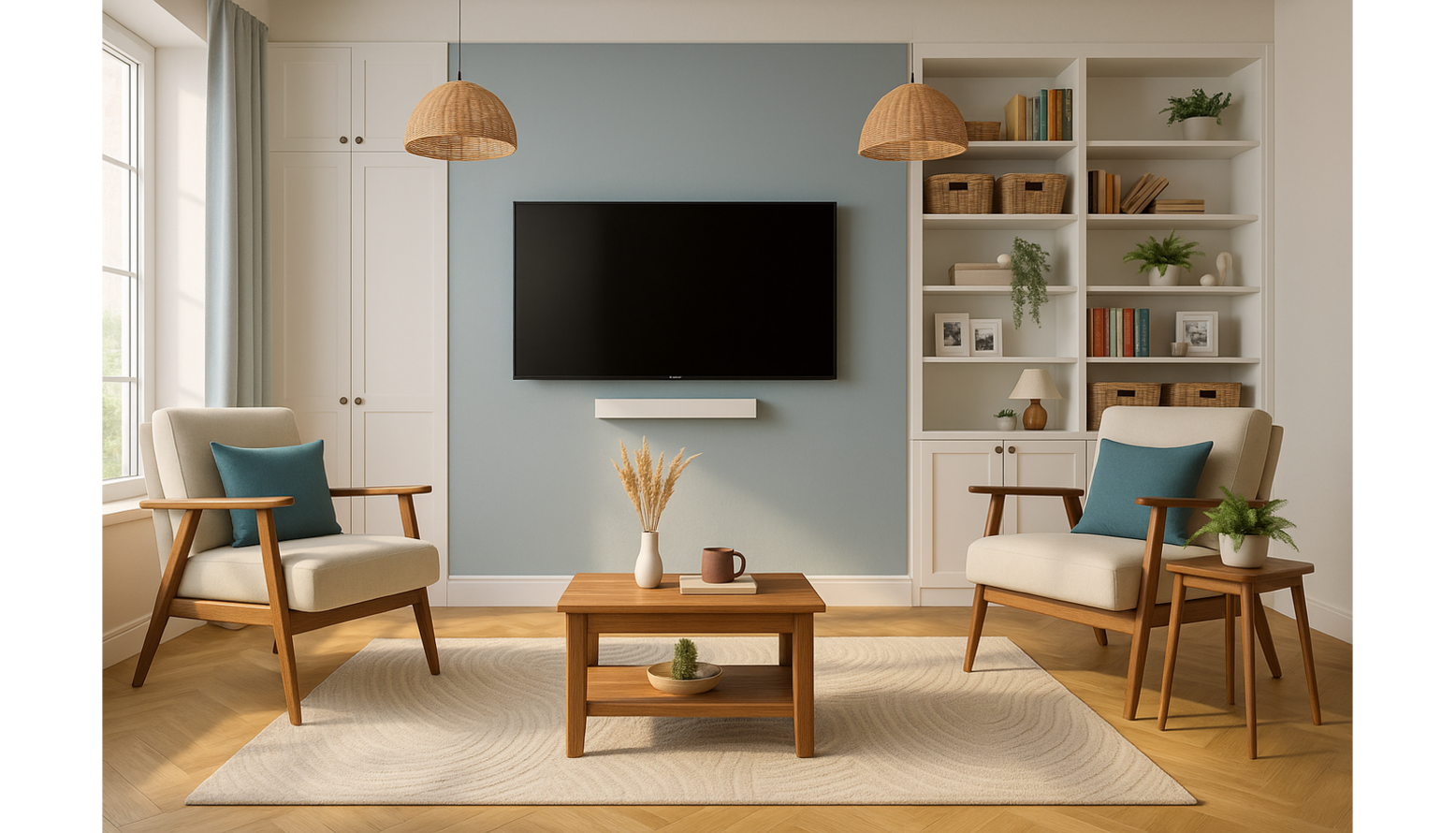 The living room design showcases a harmonious blend of contemporary elements, highlighted by a soft color palette that includes soothing shades of blue, beige, and natural wood tones.