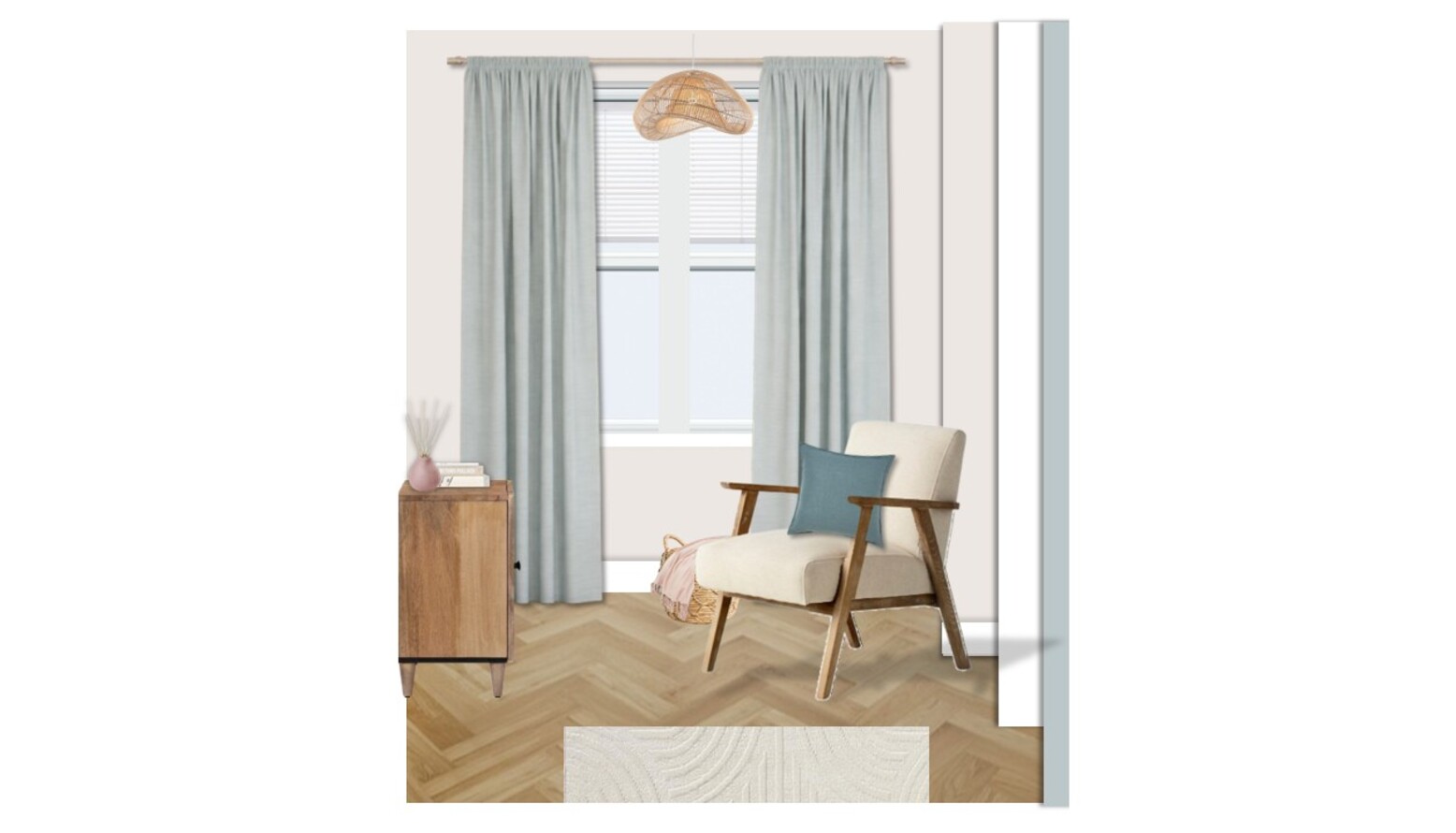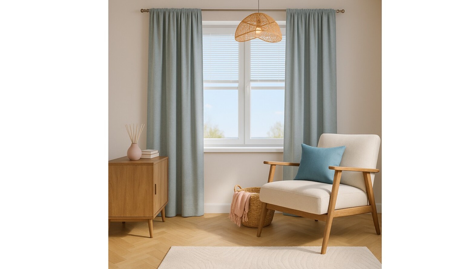 The walls are painted a calming light blue, creating a serene backdrop for the space, complemented by stylish woven pendant lights that add texture and a warm glow.