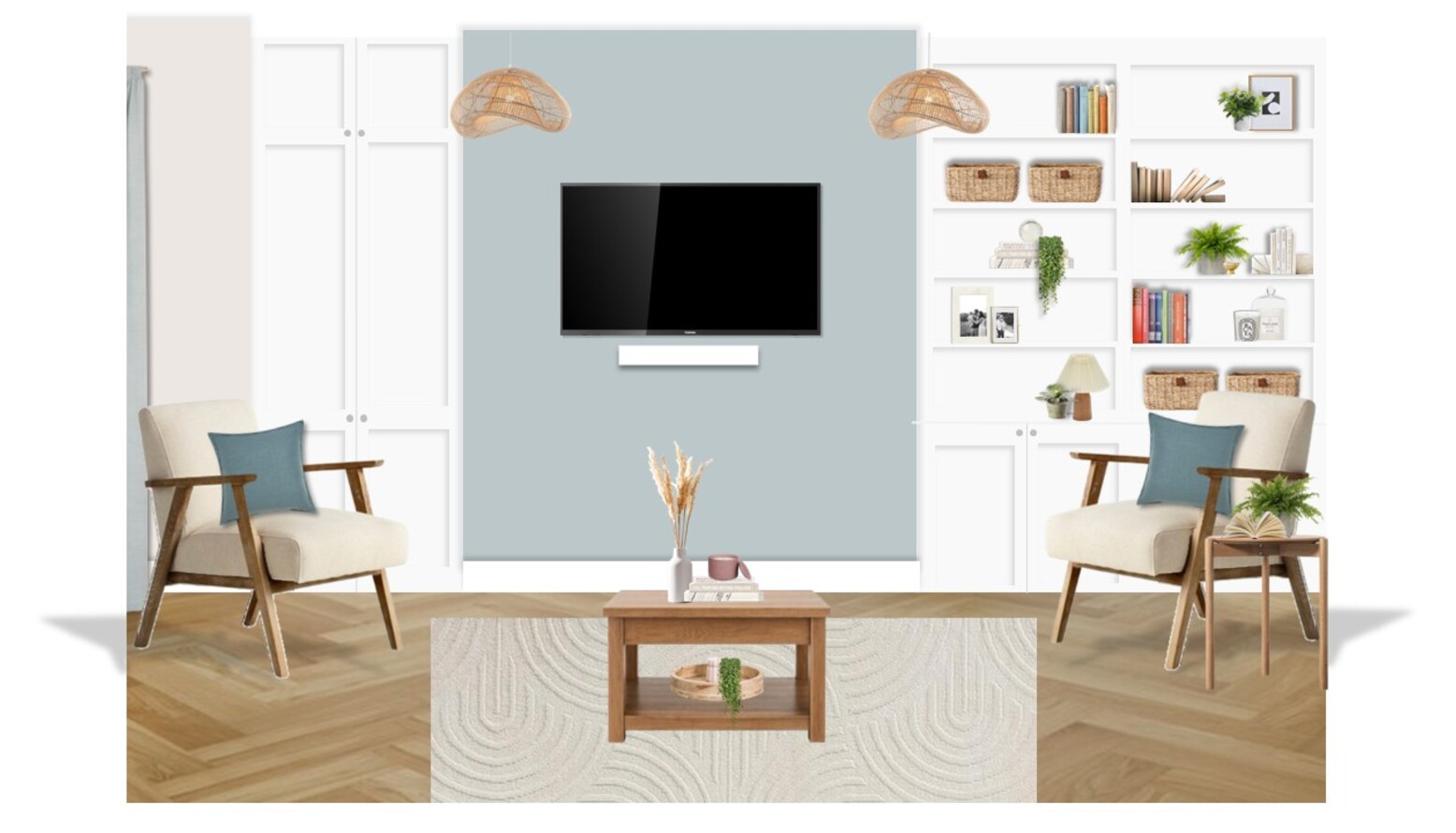 A sleek media unit is mounted on the wall, flanked by open shelves that feature decorative baskets and books, enhancing both the organization and aesthetics of the room.