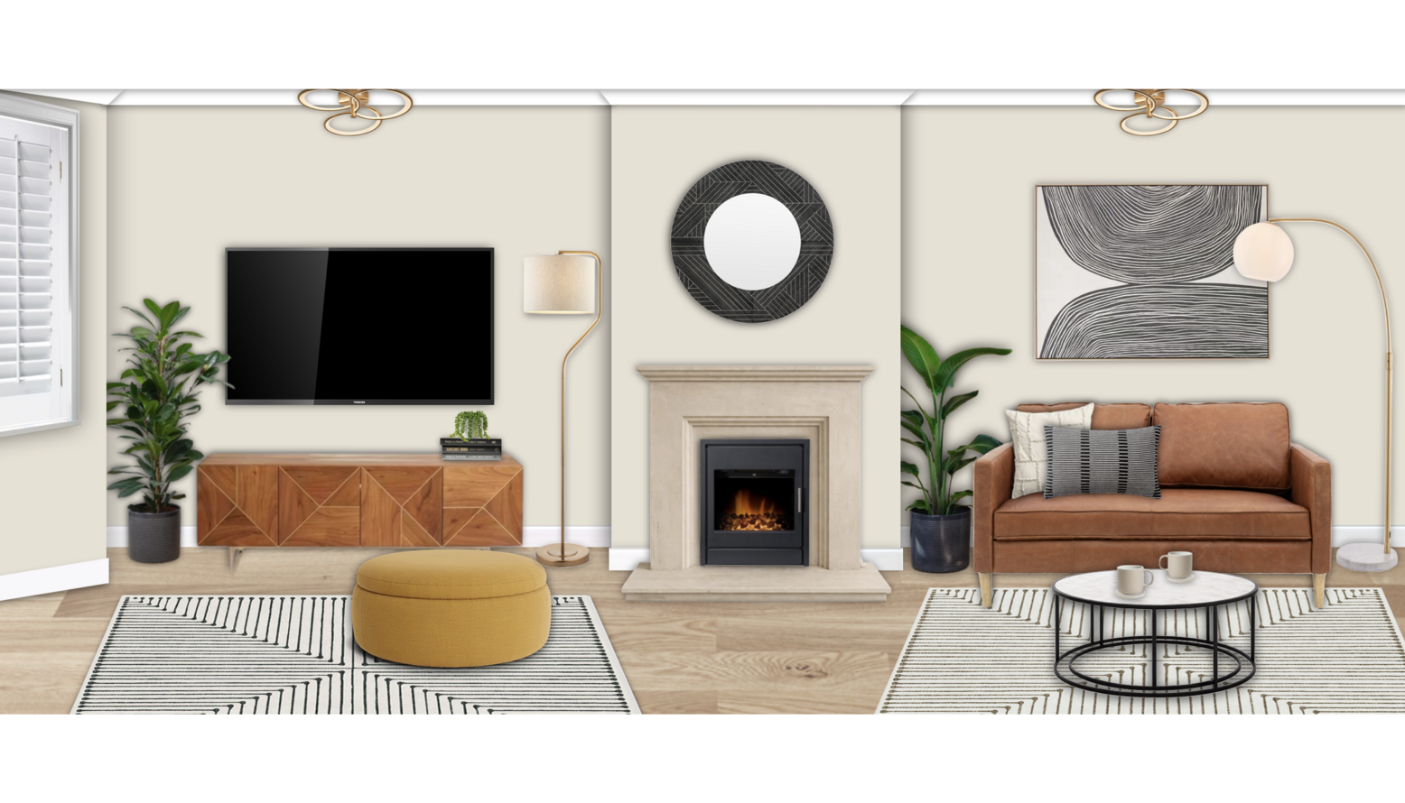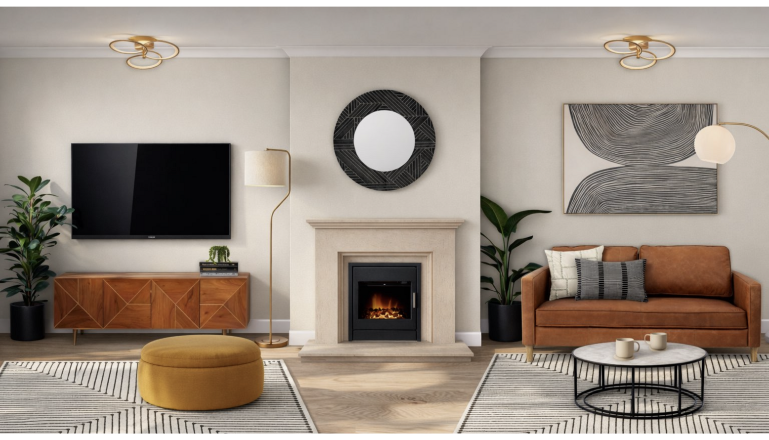 The living room exudes a warm and contemporary aesthetic, anchored by a combination of textured and smooth surfaces. A centerpiece is the rich brown leather sofa, providing a cozy yet stylish seating option alongside a vibrant yellow storage ottoman that adds a pop of color. A sleek wooden TV stand, designed to hold up to 65" displays, complements the warm tones present in the room. Soft rugs, featuring black and ivory patterns, are strategically placed to define the seating areas and add comfort. The room is illuminated by a combination of modern lighting elements, including a floor lamp and an elegant ceiling fixture, creating a welcoming atmosphere. Framed abstract artwork adorns the walls, enhancing visual interest while maintaining a subtle color palette. Potted plants contribute to a lively feeling, balancing the interior elements with a natural touch. The fireplace is a striking feature, framed by light-colored stone and equipped with an electric inset stove, further enhancing the room's inviting ambiance. Overall, the living room achieves a harmonious blend of comfort, style, and functionality.
