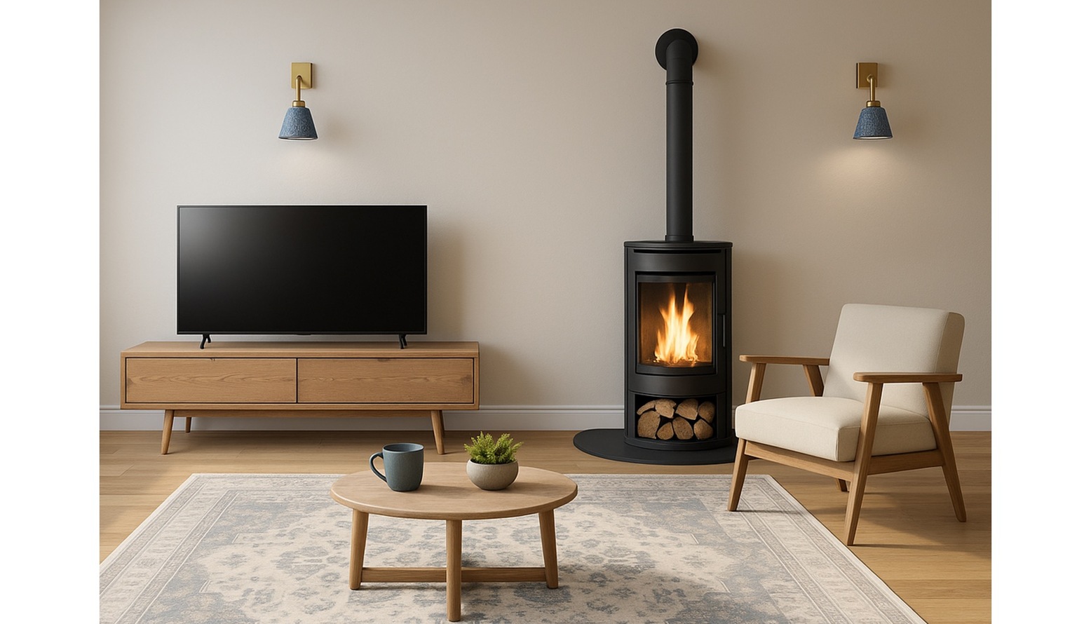 Soft textiles are emphasized with the Kira Soft Blue Rug, which defines the seating area, and a 100% grey wool round rug, creating a layered look. The room is brightened with various lighting sources, including the Diabolo rechargeable table lamp in a glossy brown finish and the Yuri table lamp in a deep brownish black.