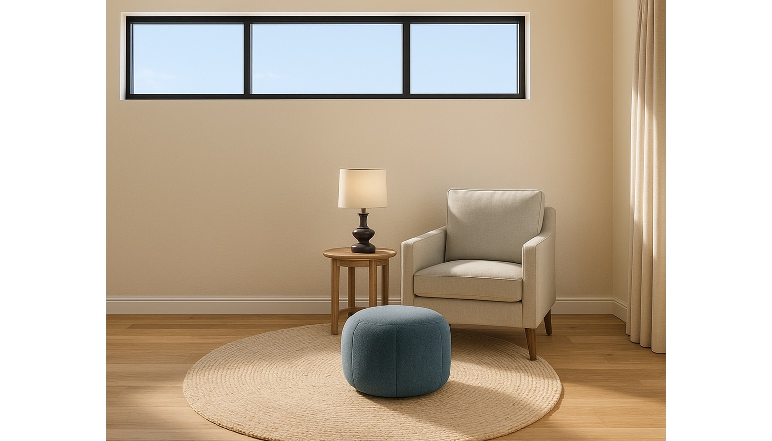 A round coffee table made of smoked glass sits at the center, providing a surface for decorative items and drinks. On one side, the Padstow Side Table adds a practical element while enhancing the design with its smoked finish. A round footstool in a Normandy brushstroke design offers flexible seating options, adding a playful note.