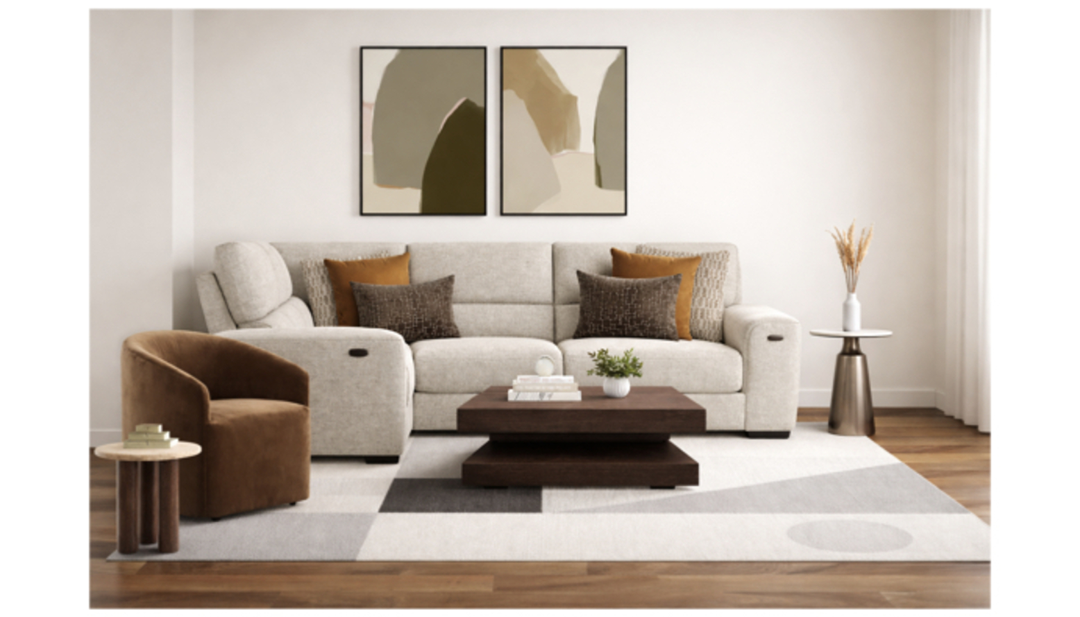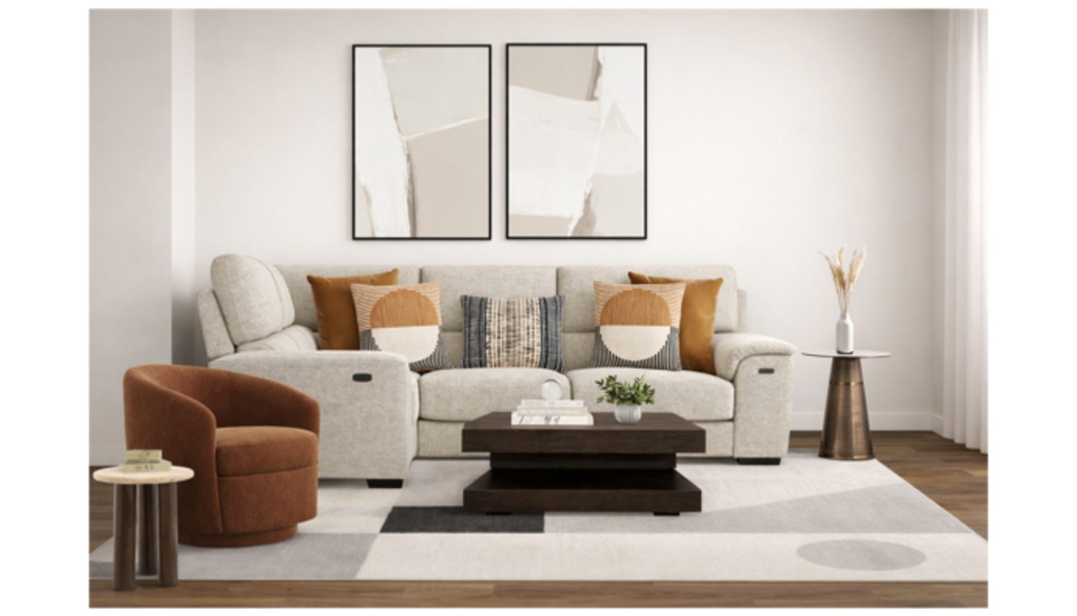 The living room exudes a warm and inviting atmosphere with its carefully curated furniture and decor. It features a plush Costello LHF Open End Chaise in Pumice House Herringbone Weave, complemented by vibrant cushions in shades of caramel and bronze.