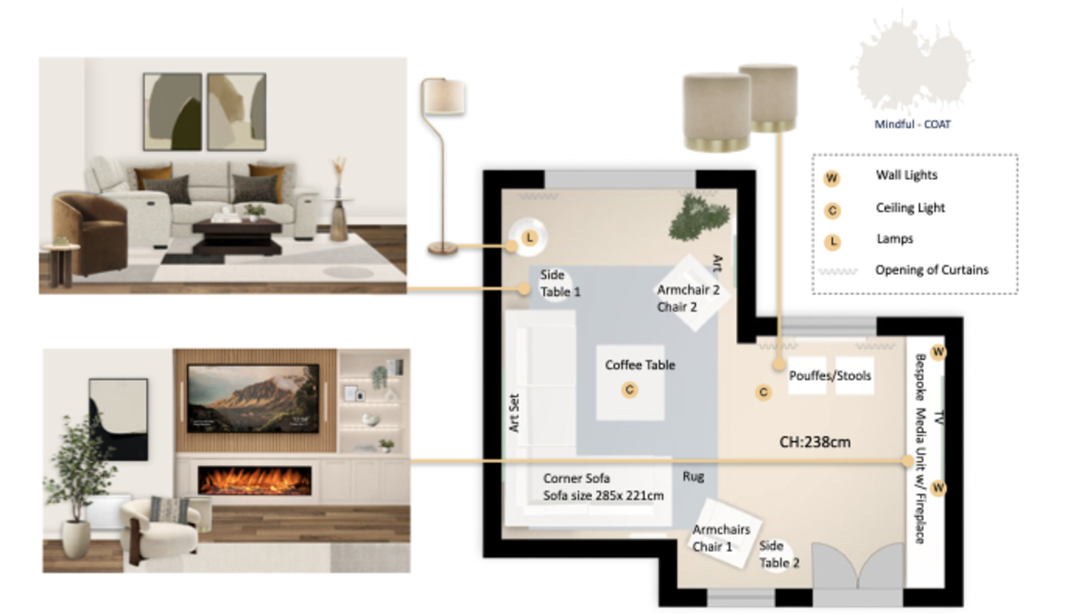 Check out this room design for our client complete with 3D visuals and floorplan.