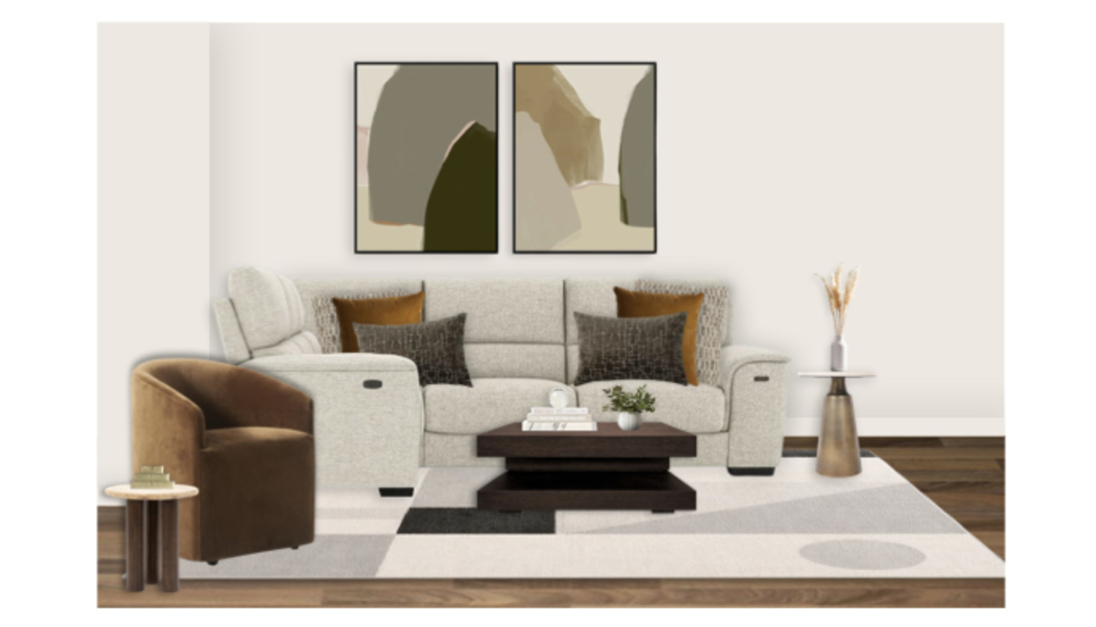 At the center, the Richmond Interiors Coffee Table Oakura Blok C Brown adds a stylish focal point, resting atop a beautifully patterned Rug Tacoma in Cream and Grey, which ties the space together. The cozy ambience is enhanced by a luxurious Granite fire-retardant armchair in beige chenille, positioned to foster relaxation.