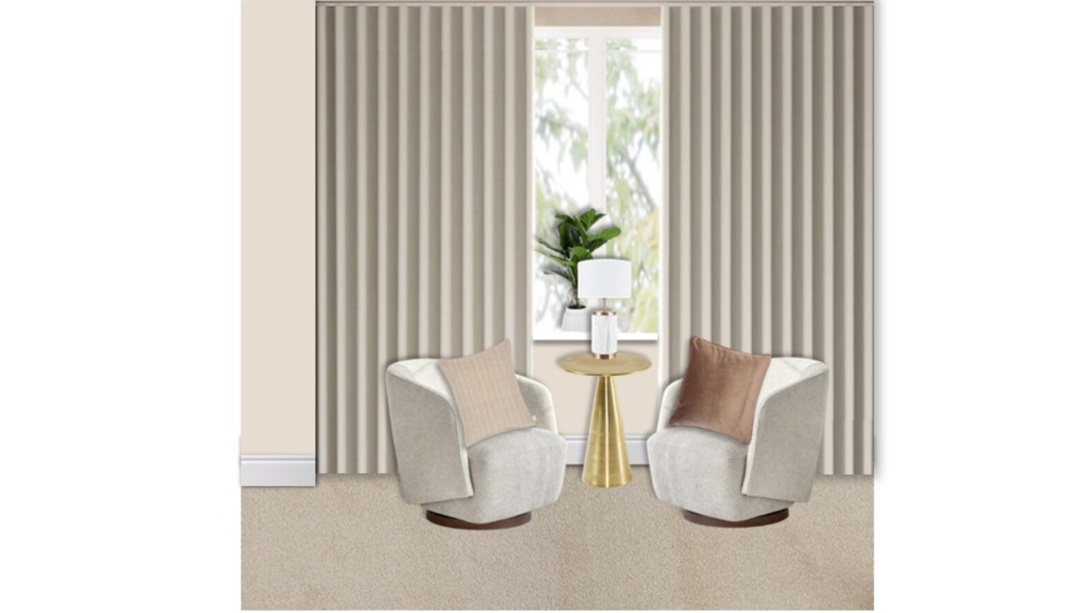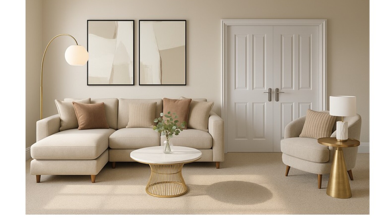 In the corner, a chic swivel chair upholstered in natural fabric complements the overall color scheme, while a metal side table with a gold finish brings a luxurious feel. A tall floor lamp illuminates the space, featuring a sleek design that enhances the aesthetic.