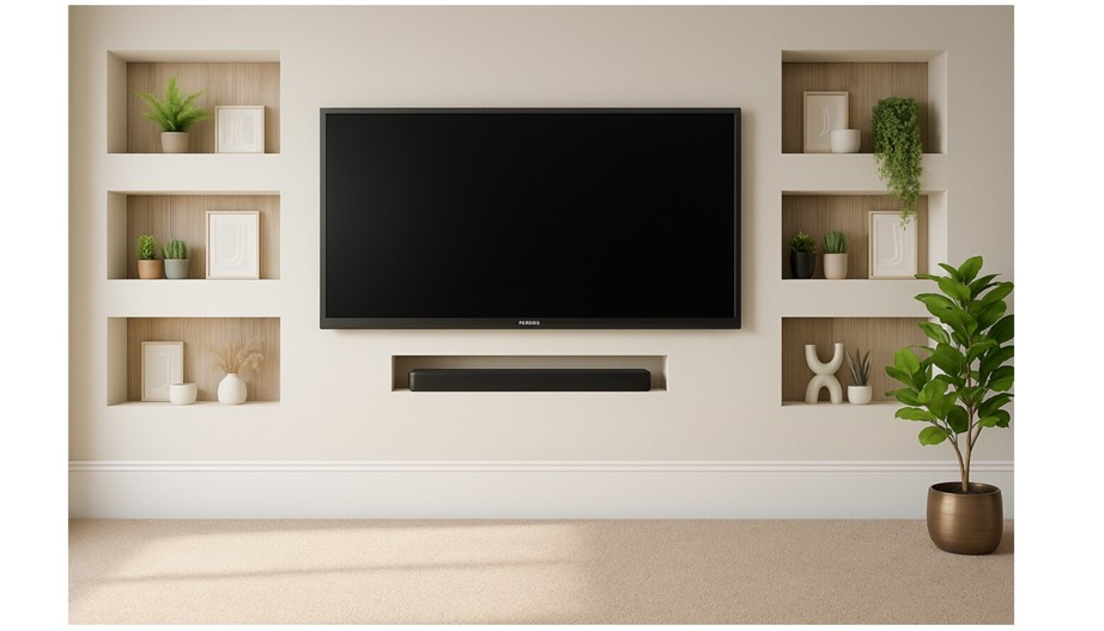 At the center of the room is a stylish coffee table crafted from champagne-hued materials, offering a modern touch with its 900x900x420mm dimensions. Surrounding the coffee table, a series of decorative items adds flair, including a set of faux plants that provide a refreshing green element.