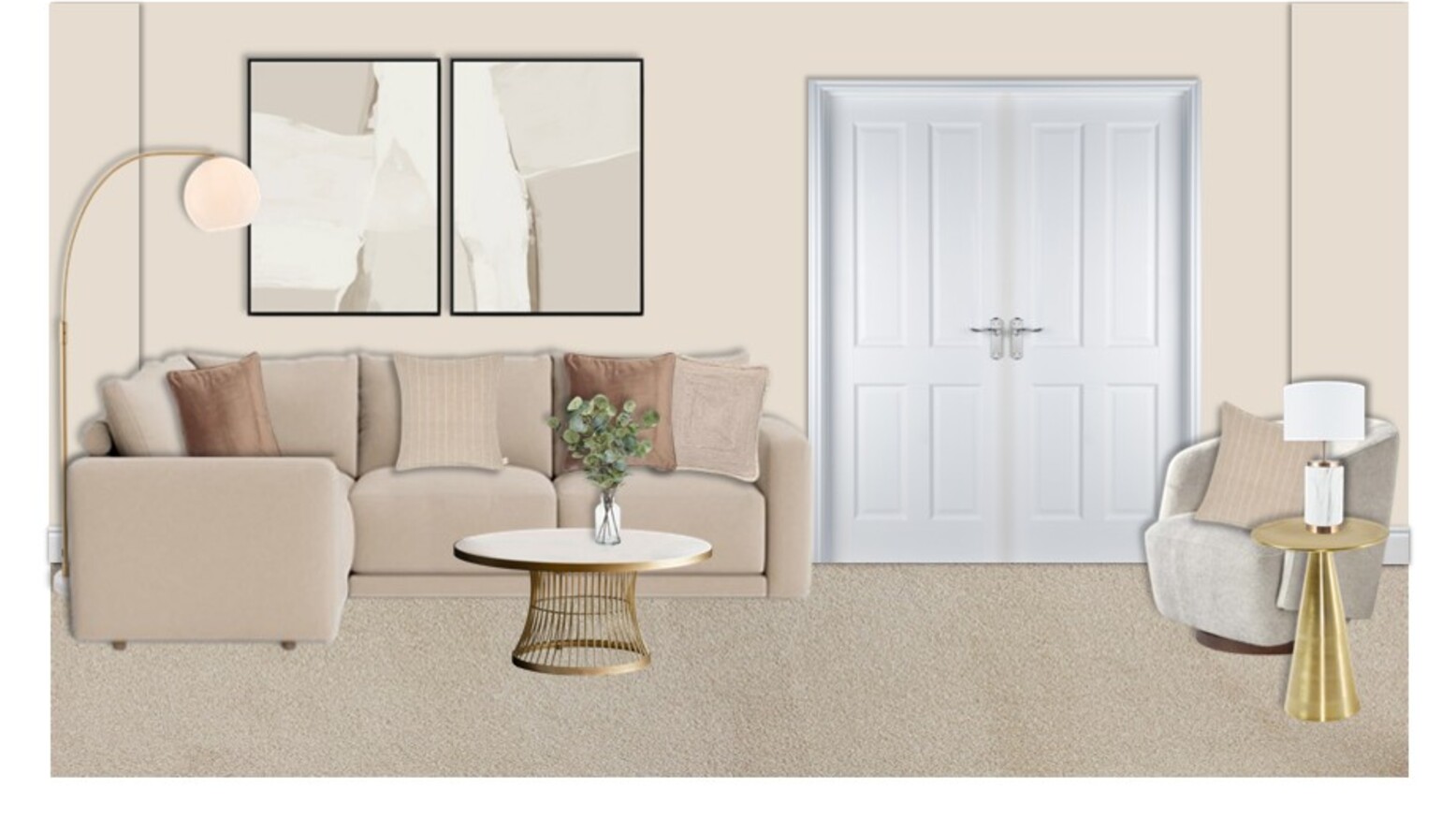 Two tasteful art pieces hang on the wall, framed in black, providing a contemporary touch that ties the room together. The door, leading to another space, remains a focal point with its classic design, while the soft, neutral-colored walls create a calm backdrop.