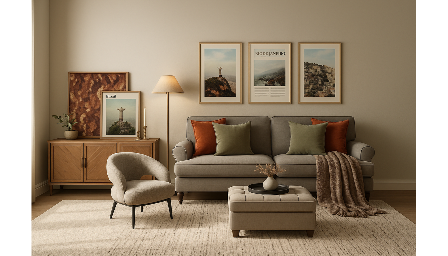 This living room showcases a harmonious blend of mid-century and contemporary styles, creating an inviting atmosphere. A plush, stoneware three-seat sofa serves as the focal point, adorned with an array of cushions in earthy tones, including a green khaki and a burnt orange.