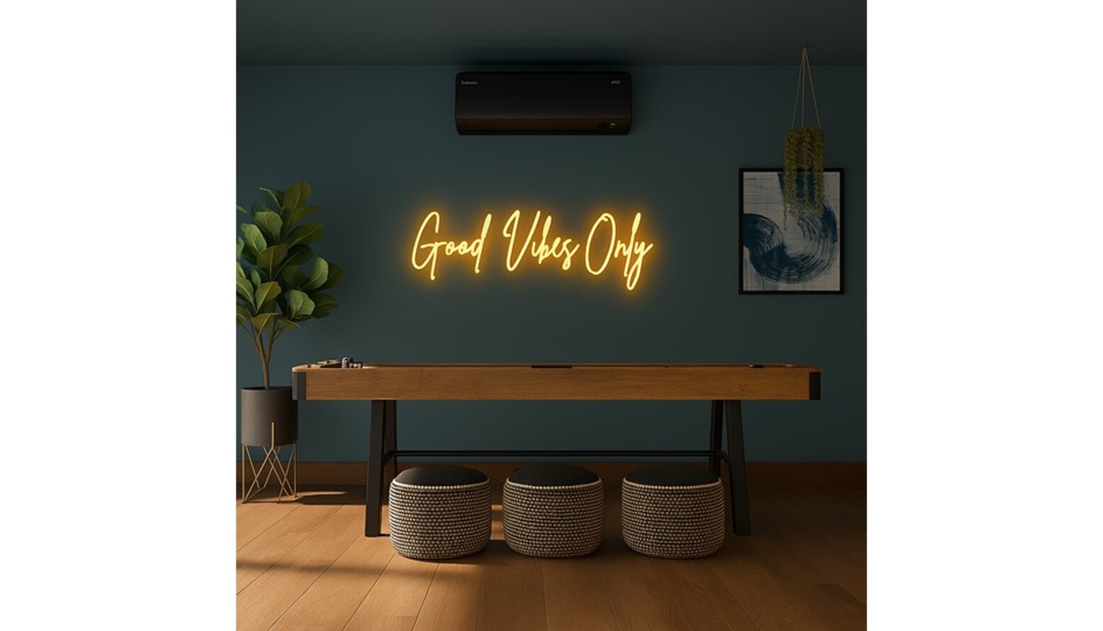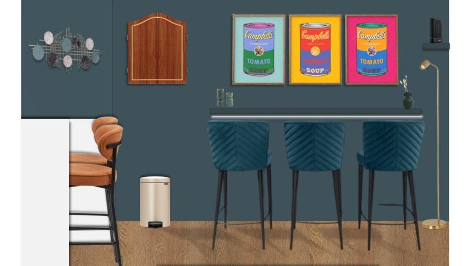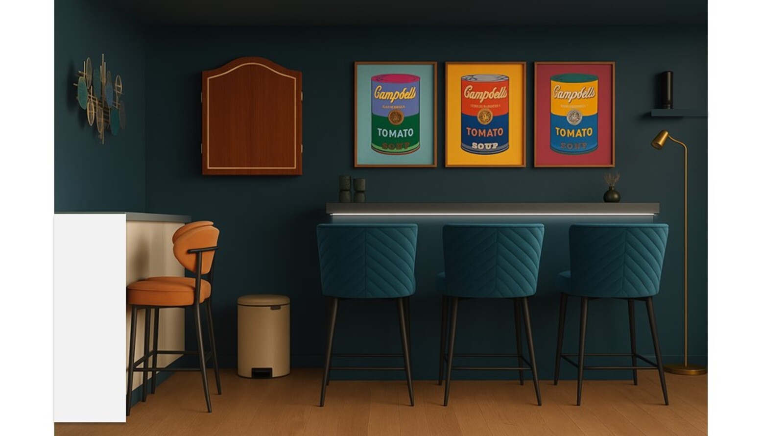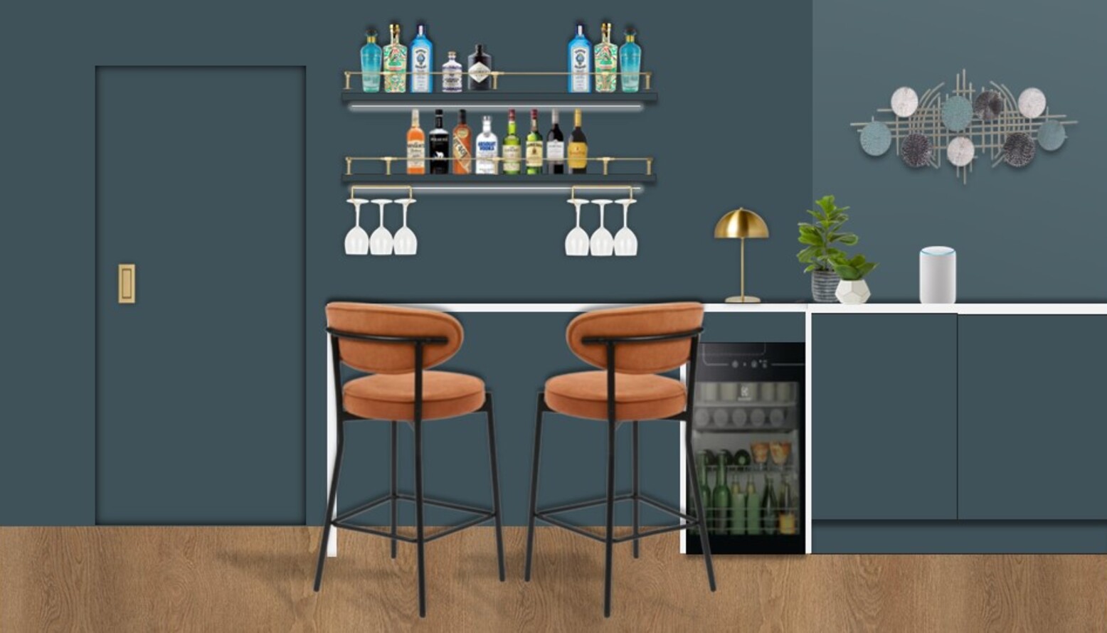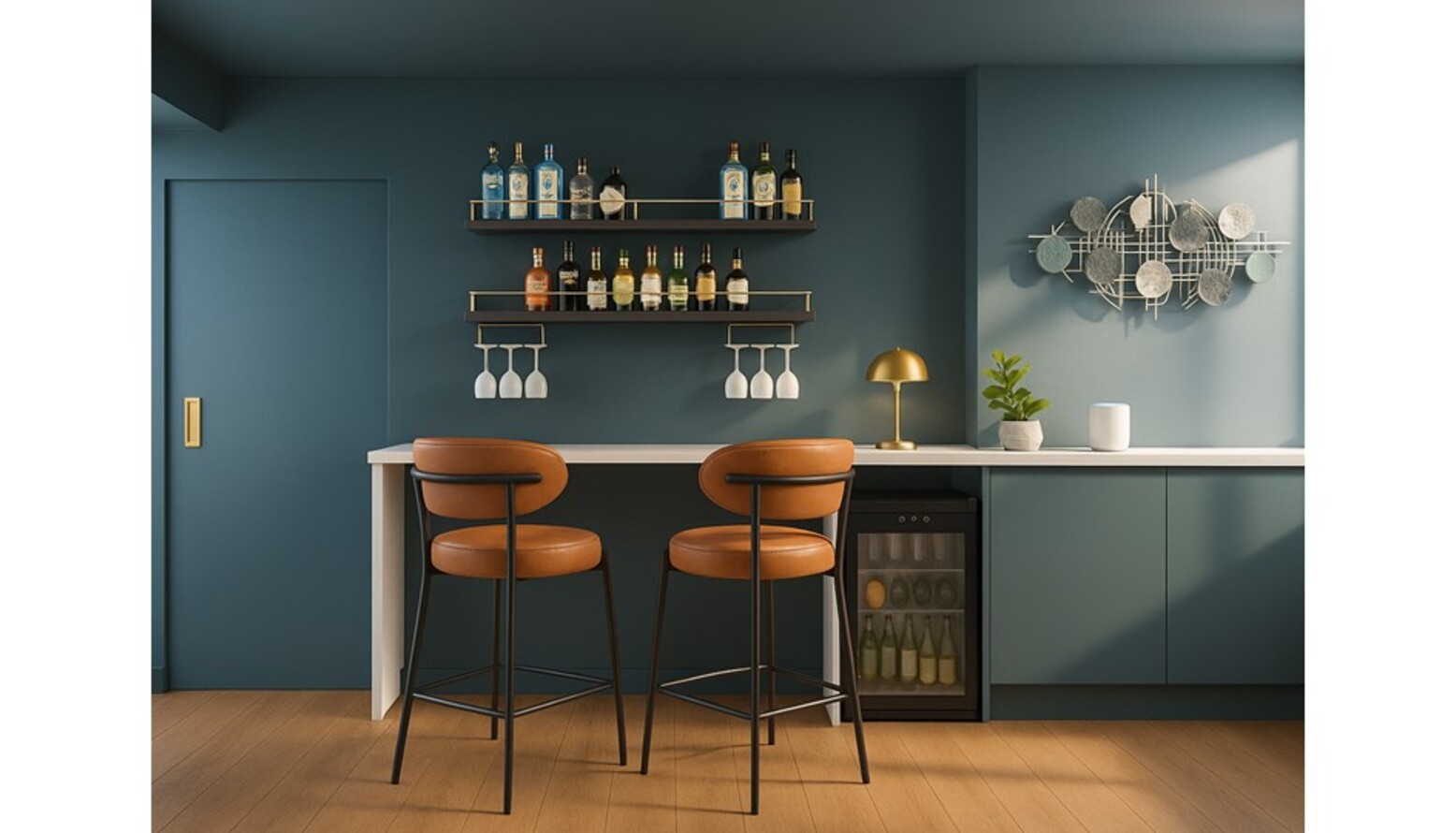This living room showcases a sophisticated and inviting design with a striking color palette. The walls are painted in a rich dark teal, providing a dramatic backdrop that enhances the overall ambiance. In the heart of the room, two sleek Danetti Serena bar stools in dark teal velvet with black metal legs are positioned at a modern countertop, inviting casual gatherings. A curated selection of wall-mounted shelves holds an array of liquors elegantly displayed, while elegant wine glasses hang below, contributing to the warm, welcoming atmosphere. A sleek brass table lamp casts a gentle light across the setting, contrasting beautifully with the dark wall. Decorative elements include a textured rug in bold black stripes that grounds the space, along with a charming faux Ficus tree and other artificial plants that add a touch of greenery without the maintenance. The room is accented with beautiful artwork, including an abstract ink wave print and framed indigo stones that tie the design together. The addition of a gold wall art piece provides a touch of luxury, pairing well with the sophisticated color scheme. Natural light spills in, accentuating the textures and colors of the space, while the warm wooden flooring complements the darker hues in a balanced manner, creating an inviting living room perfect for both relaxation and entertainment.