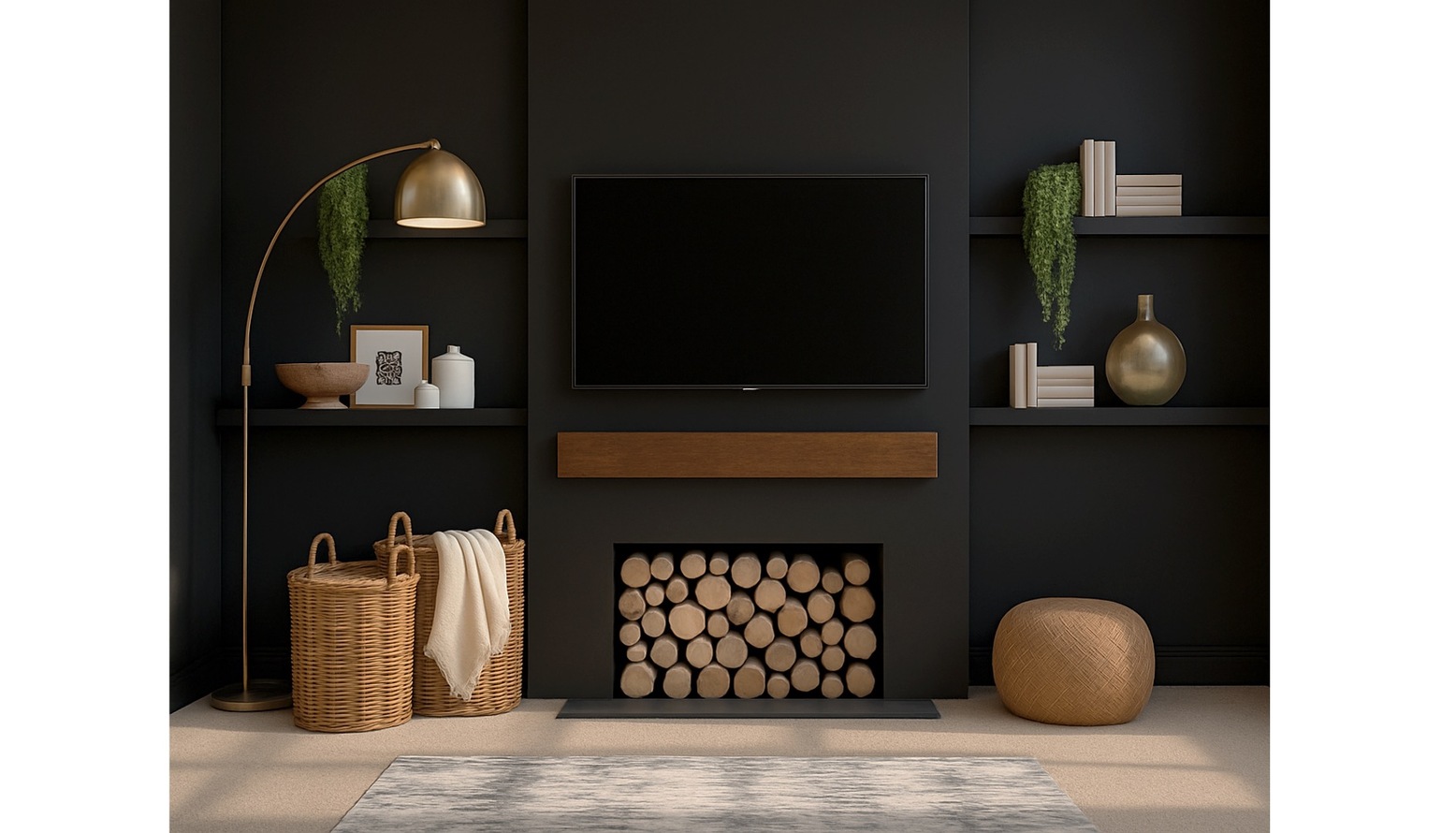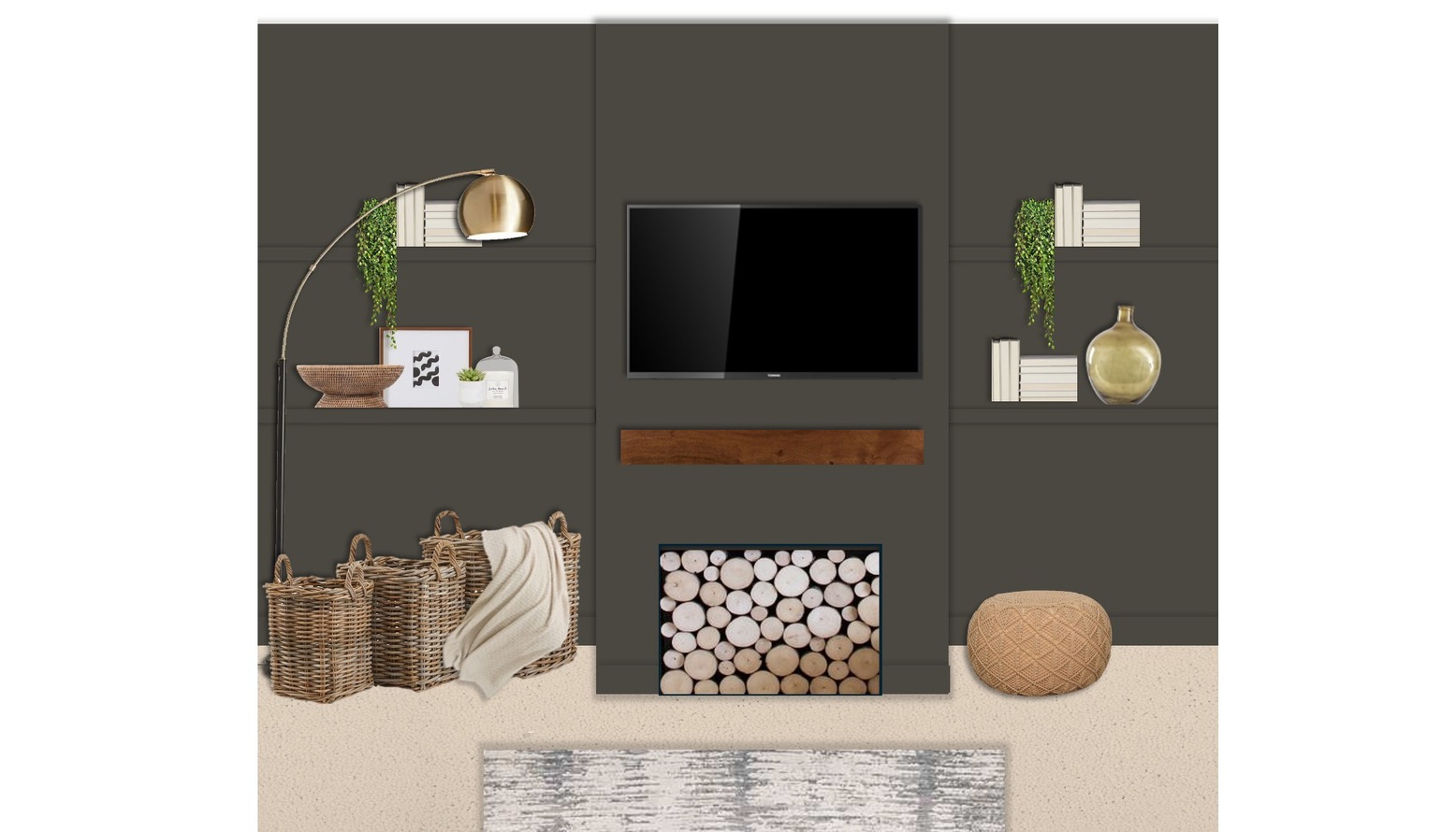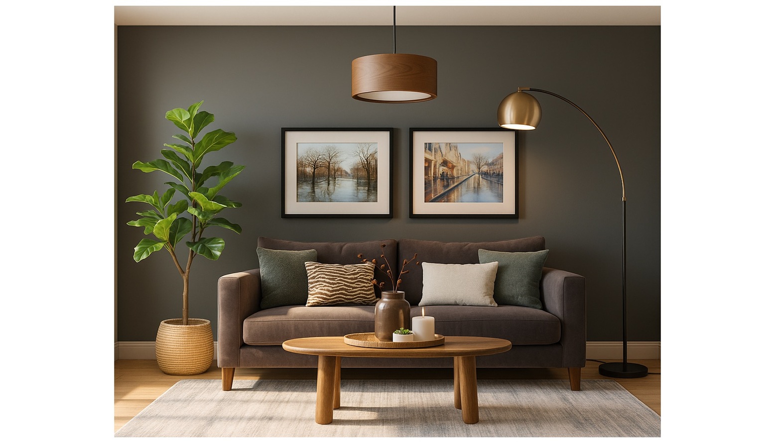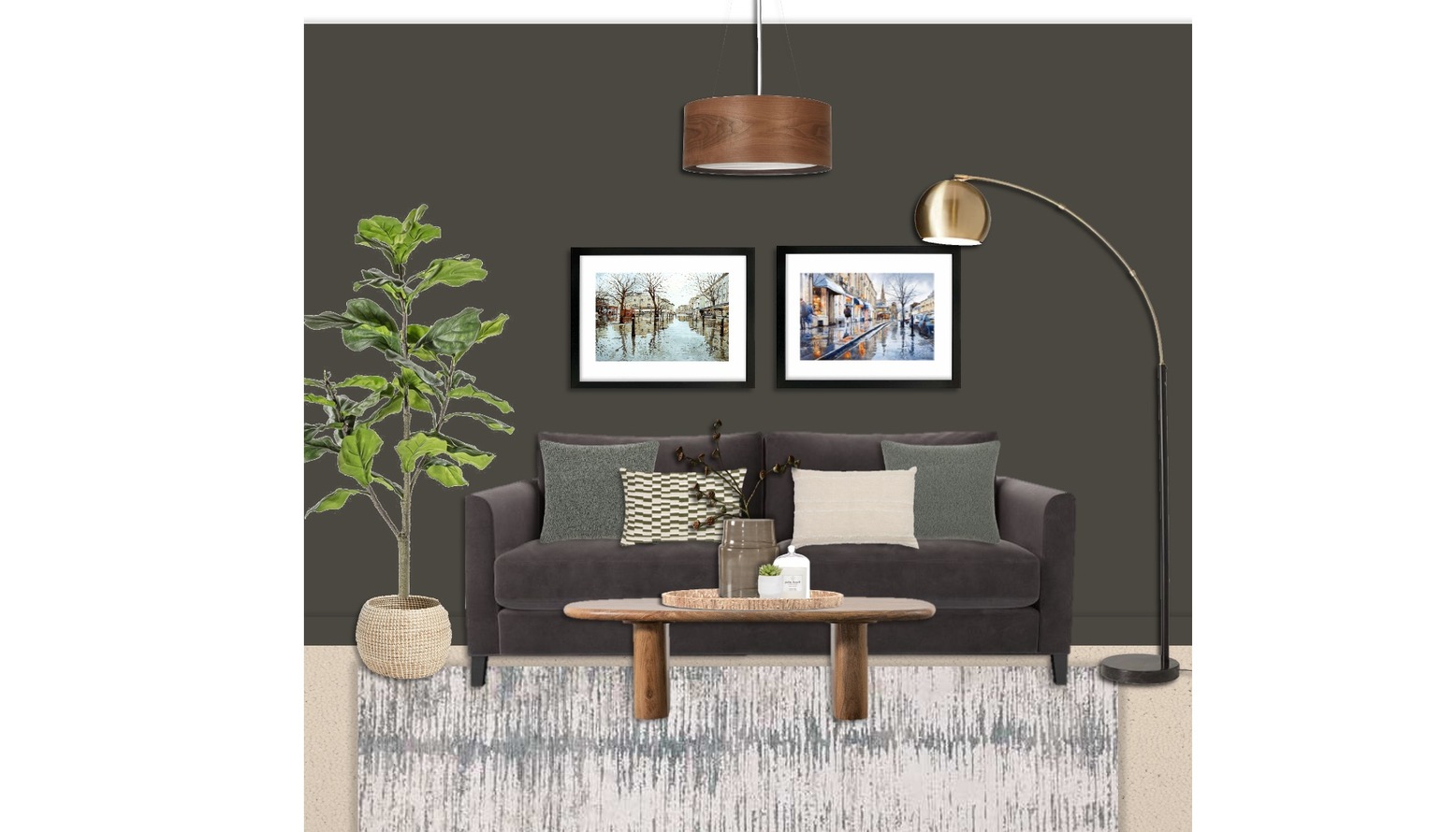 The living room exudes a cozy and inviting ambiance, featuring a rich, dark wall color that sets a warm tone for the space. At the heart of the room is a comfortable Izzy 2.5 seat sofa in a soft Arctic Seal Easy Cotton fabric, adorned with a mix of cushions in greige, sage, and a playful zebra print. A charming Loaf Groover love seat in vibrant green velvet complements the main seating area and adds a pop of color. A stylish Hoffman coffee table with an elongated oval shape sits centrally, crafted from warm wood, complemented by an assortment of decorative elements on top, including a vase, candles, and a small succulent. The walls are adorned with framed artwork depicting serene landscapes, providing a touch of sophistication. Illumination is provided by a chic John Lewis Mia ceiling light in walnut, along with an elegant Hector floor lamp in antique brass that arches gracefully, enhancing the room’s overall elegance. The space is further enriched by the presence of a potted fiddle tree, which brings in a touch of nature, and decorative logs that add an organic feel. Layered underfoot is a soft 200x300cm AN15 area rug, grounding the room and providing comfort. The overall layout cleverly maximizes the space, with an Arundel bookcase featuring a combination of green and grey tones for stylish storage options. Nearby, a beige pouffe invites relaxation, making it easy to create a snug atmosphere. Additions like bespoke shelving and wall-mounted furniture offer practical yet aesthetically pleasing storage solutions, while the carefully chosen plants and window dressings ensure an inviting and vibrant living space.