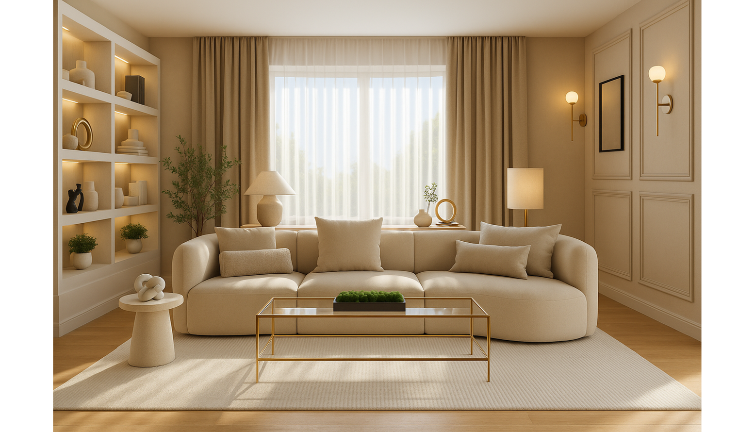 The seating area is anchored by a plush, curved sofa in a soft beige tone, accented with several light-colored cushions for comfort.