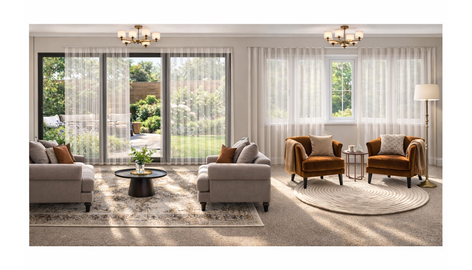 Rugs are a fantastic way to do this - the change in flooring makes a clear distinction that this is a seating area. It also helps to position your sofa and armchairs around a central coffee table so you’re creating a focal point and also the chairs act as a divider to the rest of the room.