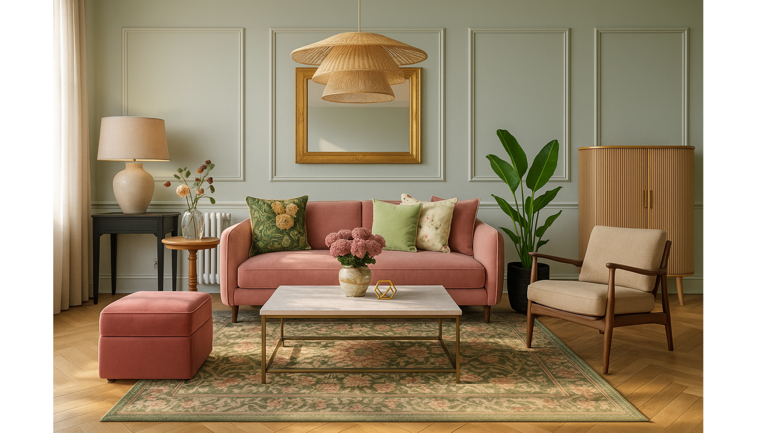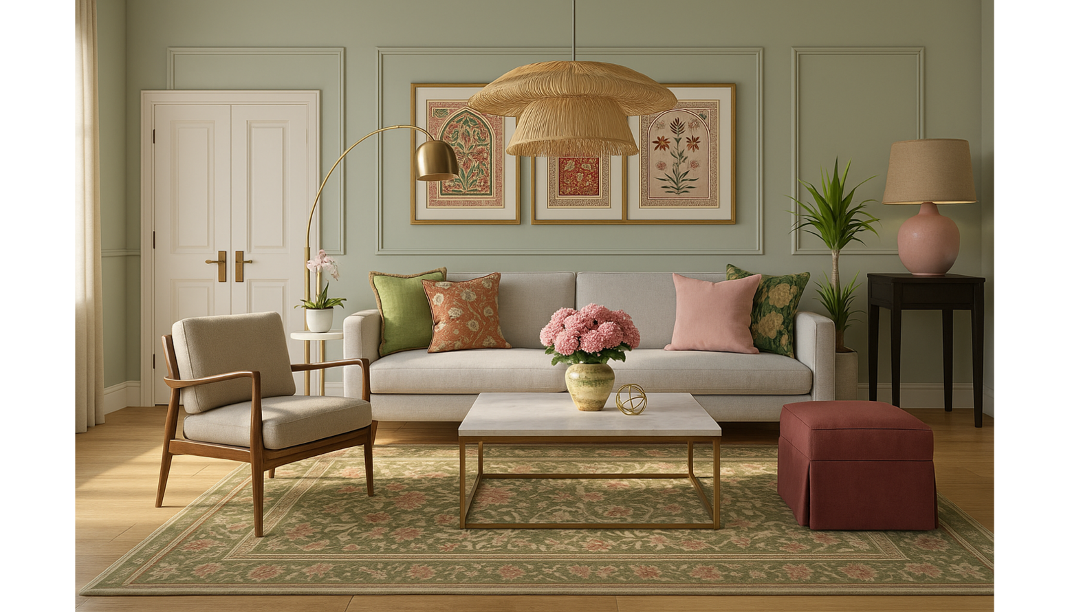 A modern sofa in a light fabric serves as the room's focal point, adorned with a mix of cushions in rich textures and colors, including a beautiful coral, a muted green, and a striking patterned orange. Above the sofa, an artful arrangement of framed botanical prints adds a touch of sophistication to the walls, enhancing the aesthetic.