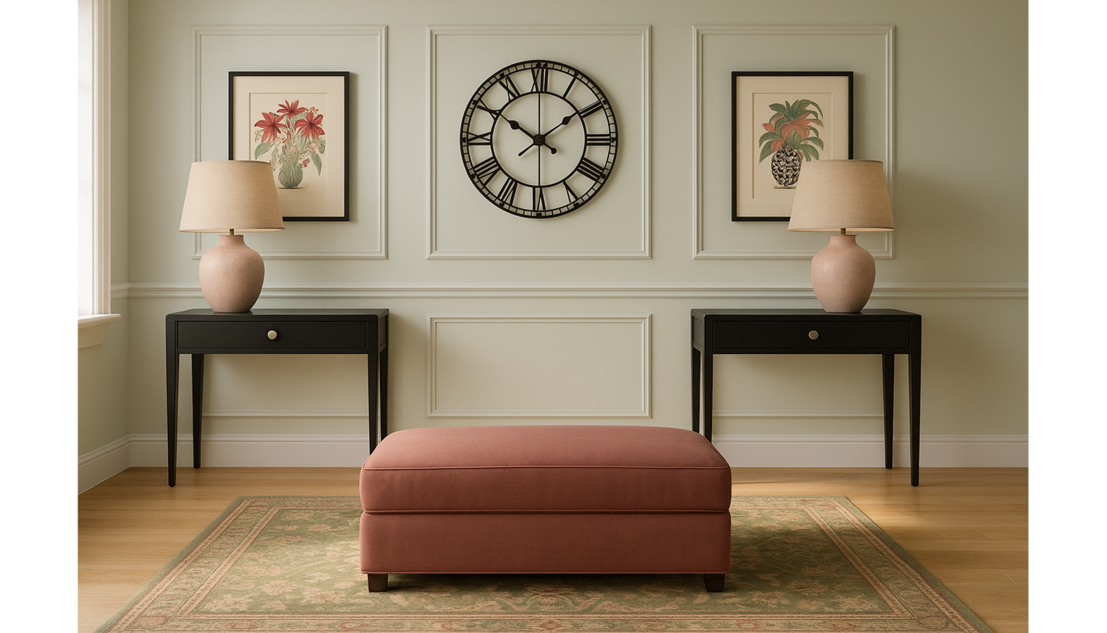 Flanking the room, a wooden console table with a rich black finish harmonizes with a light oak drinks cabinet, providing practical storage solutions while contributing to the overall design.