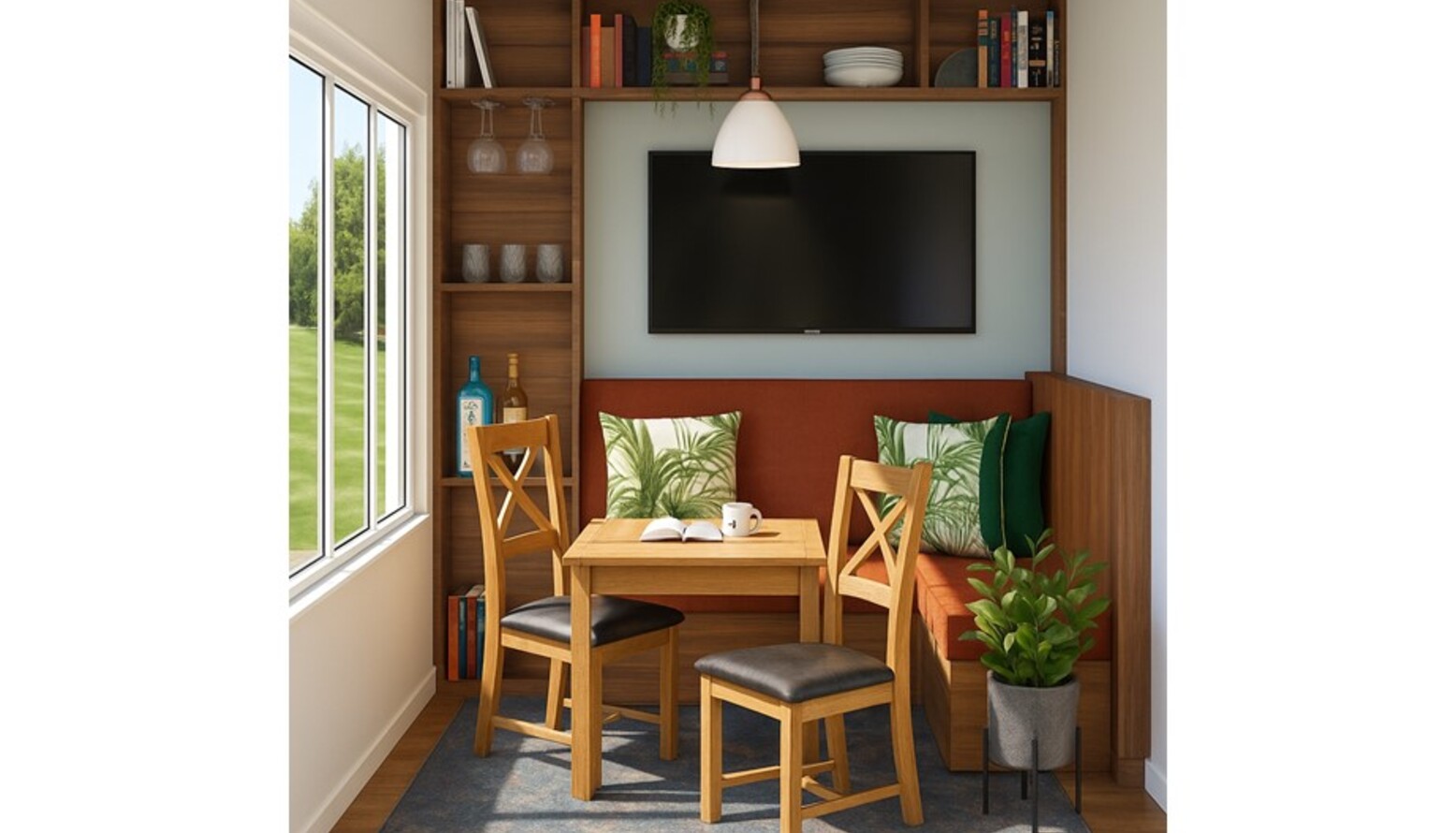To add texture, vibrant palm leaf cushions adorn the built-in bench seating. Above, a pendant light casts a soft glow over the dining area, enhancing the intimate feel of the space.