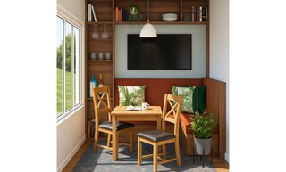 The dining room features a cozy and inviting atmosphere as it is designed with a warm color palette and a blend of natural materials. The focal point is a wooden dining table complemented by two matching chairs with black seats, providing a comfortable dining experience.