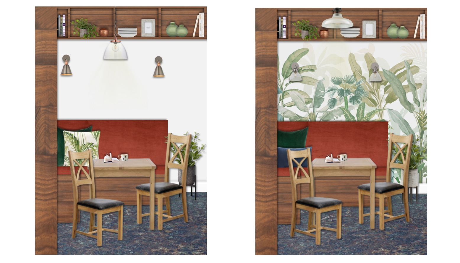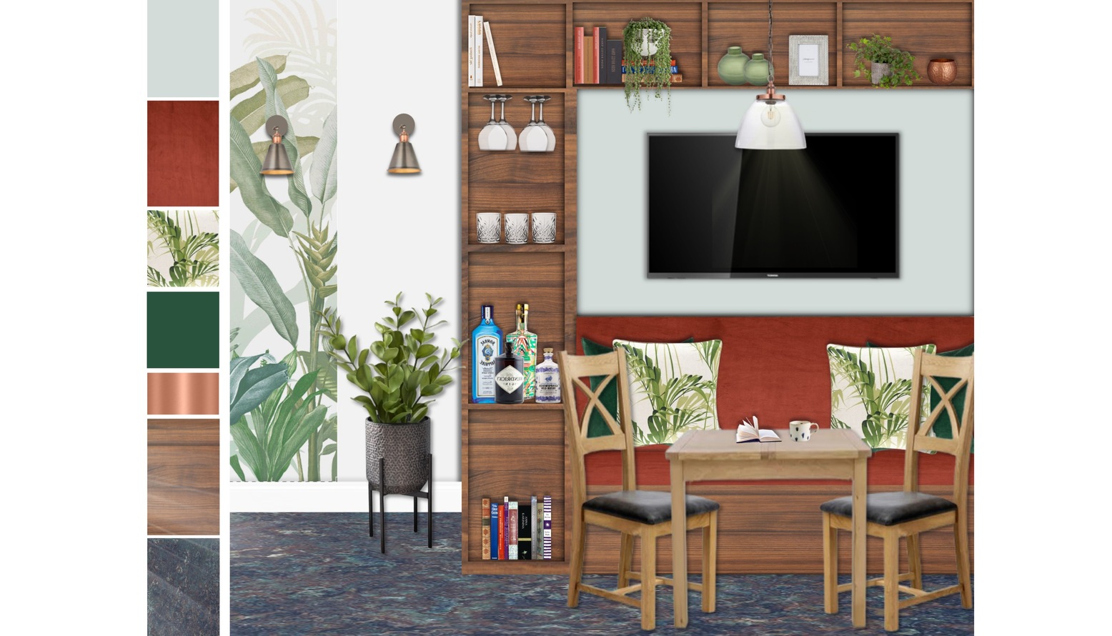 On the wall behind the table, a shelving unit made of rich wood holds decorative items, including vases and books, while also offering functional storage. A lush green plant adds a touch of nature to the corner, harmonizing with the tropical theme introduced by the cushions.
