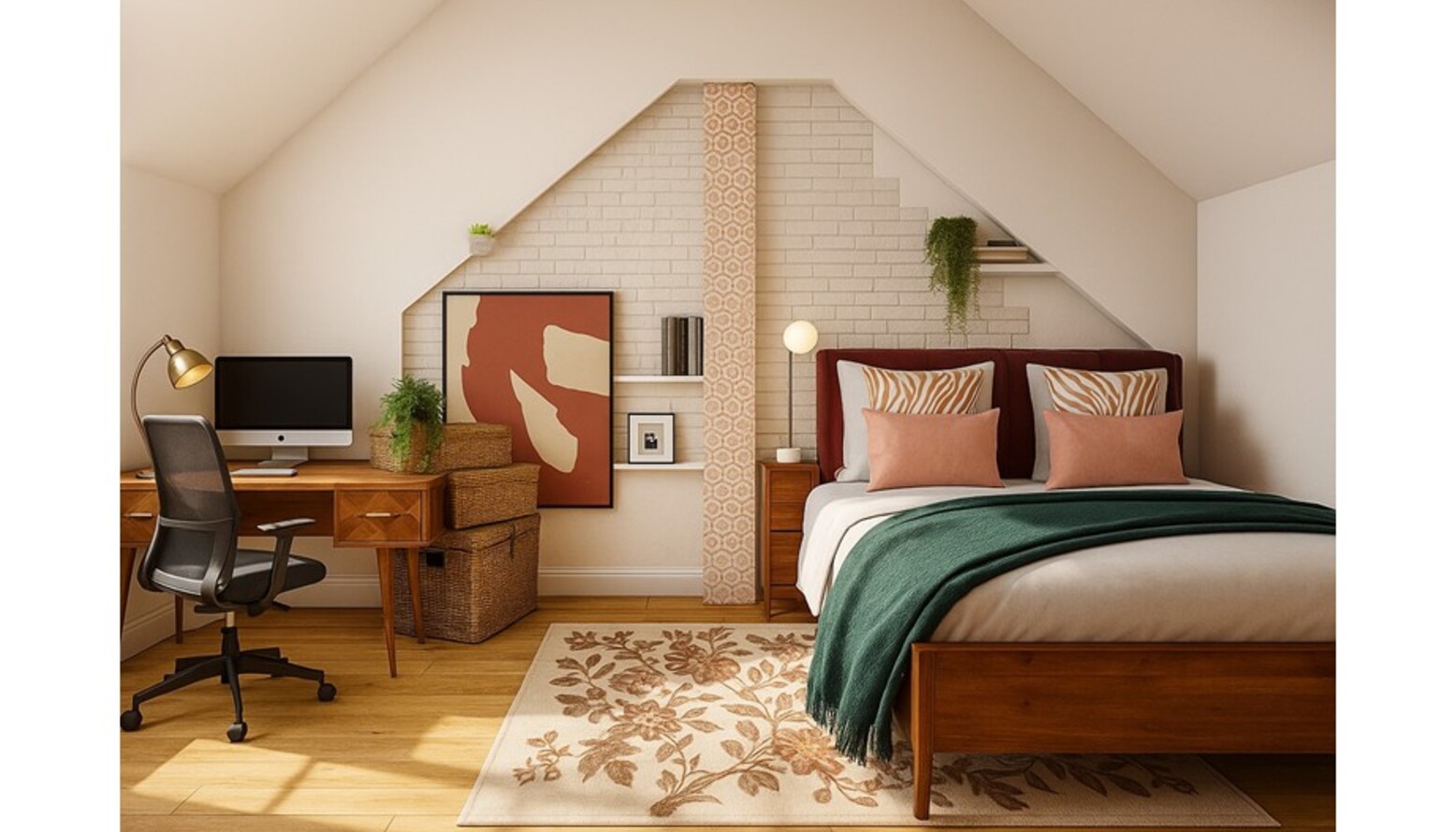 This loft bedroom boasts a warm, inviting atmosphere enhanced by natural light filtering through the ceiling. The room features a mixture of earthy tones and cozy textures, with a rich brown wooden bed frame anchoring the space.