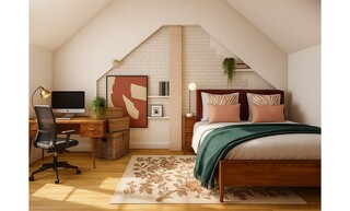 Soft underfoot, a patterned rug grounds the space, tying together the various hues present in the room. Potted plants add a splash of greenery, perfectly completing the serene ambiance, making this loft bedroom a perfect retreat.