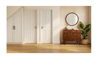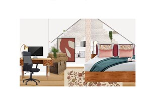 In the adjacent corner, a wooden desk paired with a modern office chair creates a functional workspace, perfect for productivity or relaxation. A stylish lamp illuminates this area, creating a cozy nook.