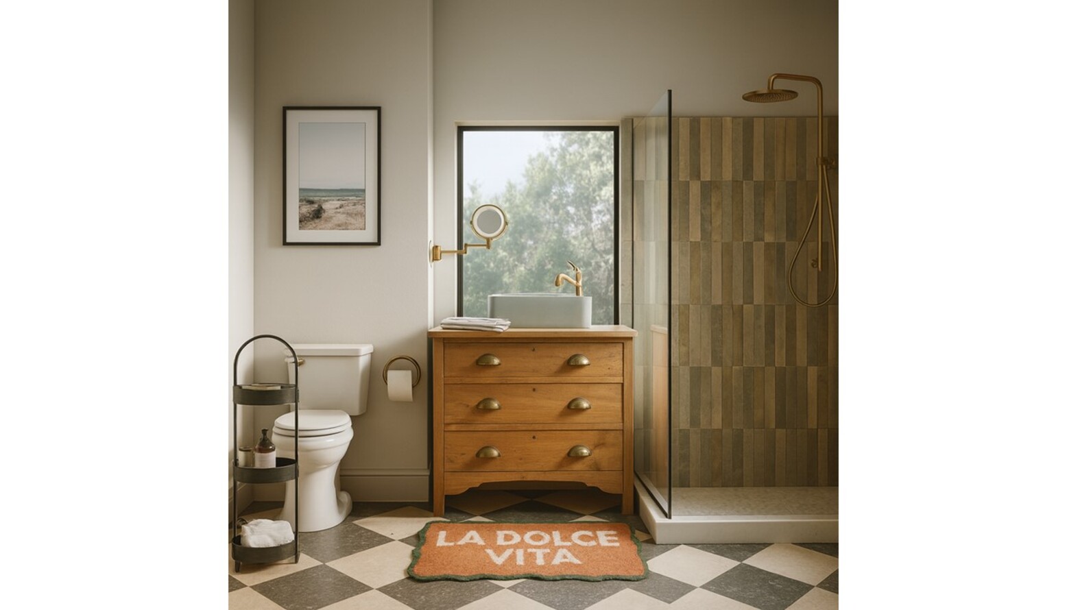 Towels are attractively displayed on a brushed brass towel ring, adding both convenience and a touch of luxury. The space is accented with elegant decor pieces including the ribbed glass soap dispenser and the distinct 'La Dolce Vita' bath mat, which adds a pop of color.