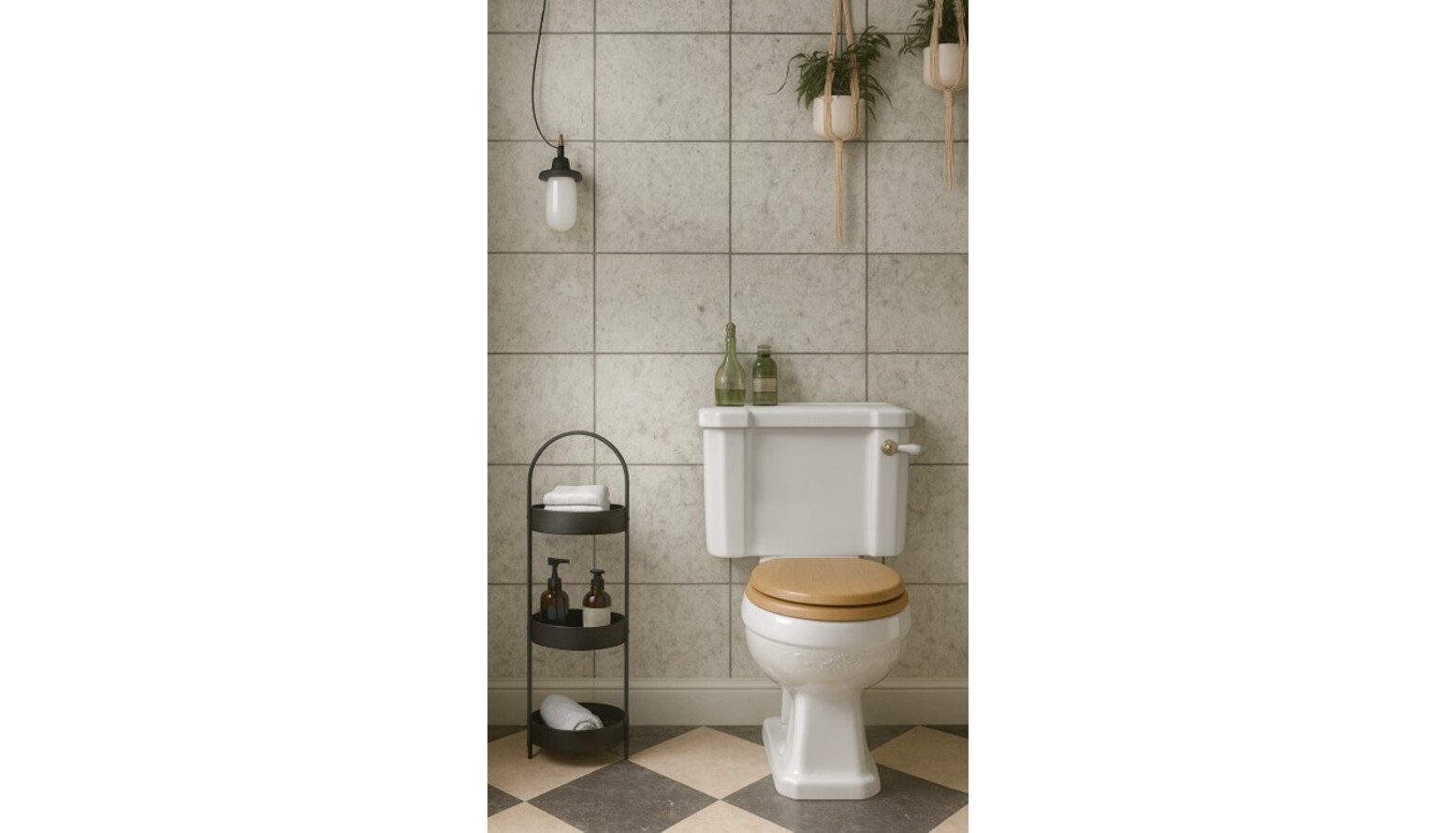 The Loft Ensuite features a harmonious blend of modern elegance and rustic charm. The floor boasts a classic black and white check pattern that adds a timeless appeal. Adjacent to the shower area is a sleek, black-framed glass shower door, presenting a minimalist yet functional entry.
