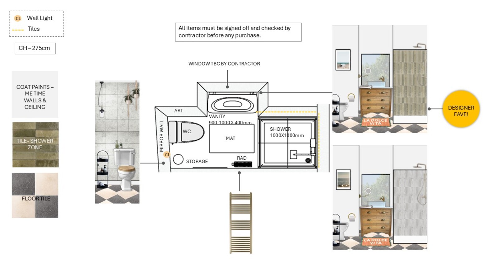 I have included some great options for the tiles in your bathroom and you can simply click on the handy link which will take you directly to the retailer so you can order any tile samples you would like to see and also send the link for your chosen tiles on to your tiler so they can check they are happy with the tiles and advise you on quantities.