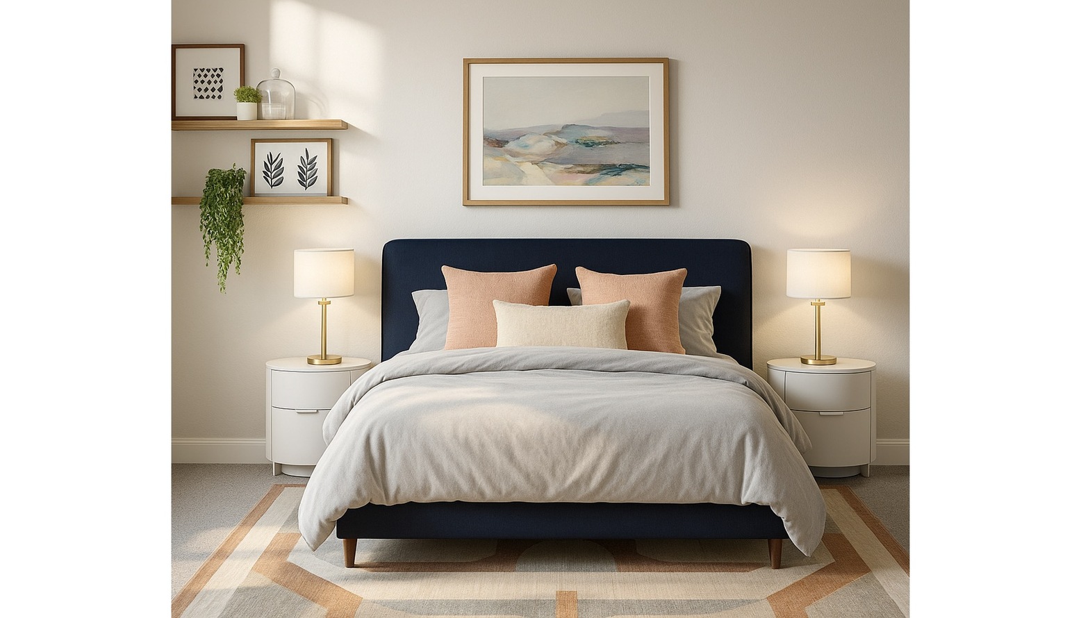 A cozy beige and brown rug anchors the room, providing warmth underfoot. Wall-mounted shelves house faux plants and decorative frames, enhancing the personal touch of the design while ensuring that floor space remains open and airy.