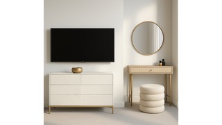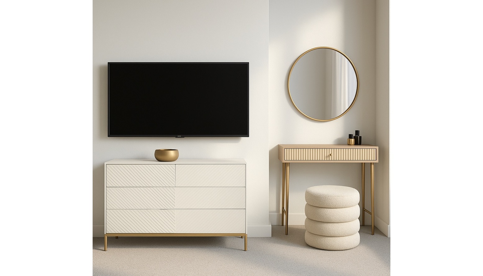 Adjacent to the bed, a compact dressing table mirrors the white gloss finish of the drawers, accentuating the clean lines of the room. The room is finished off with a round gold mirror that adds dimension and reflects light, making the space feel larger than it is.