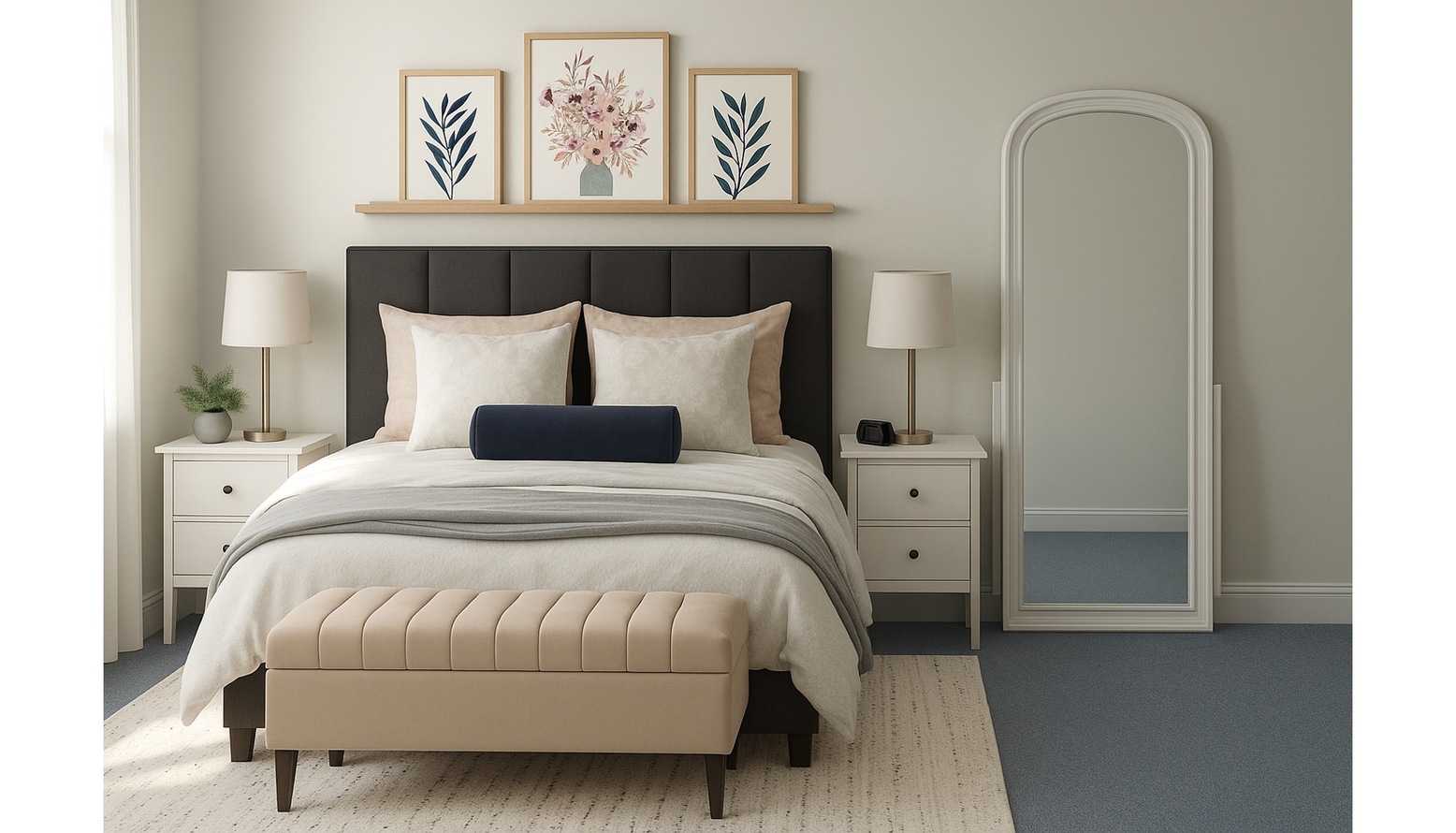 Above the headboard, three art pieces gracefully hang on a wooden shelf, offering a touch of personal expression. The color scheme integrates natural hues, harmonizing beautifully with the overall decor.