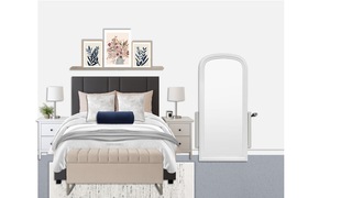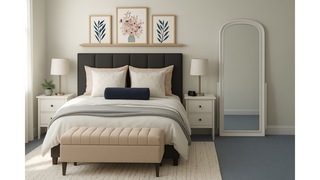 A chic ottoman bench sits at the foot of the bed, enhancing the comfort while adding functional storage. Natural elements are introduced with a faux plant perched beside one of the lamps, further enriching the room's inviting ambiance.