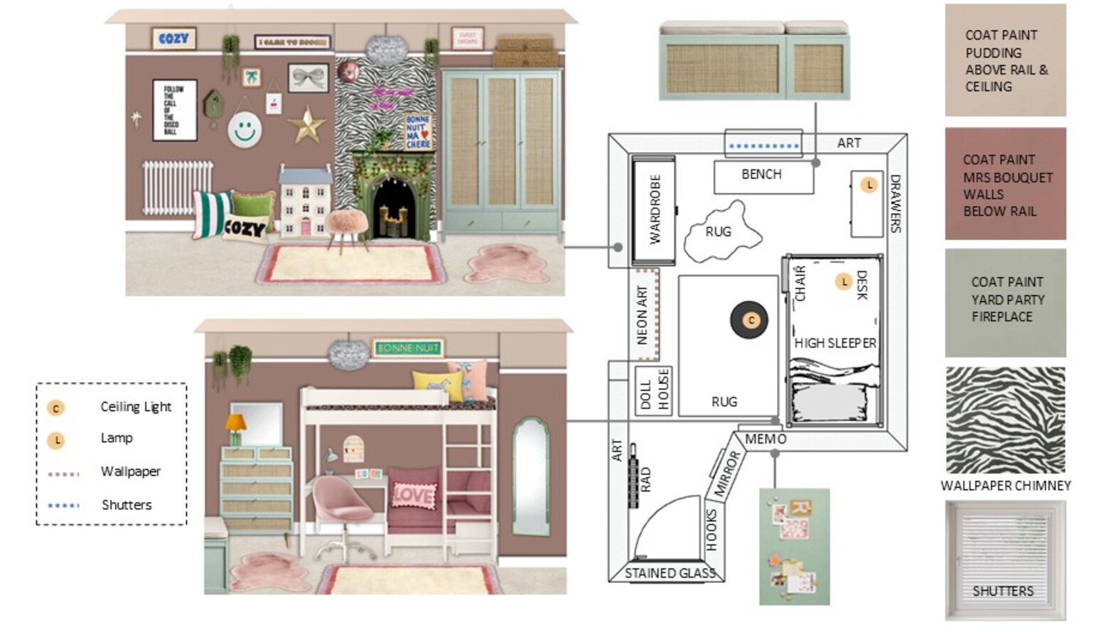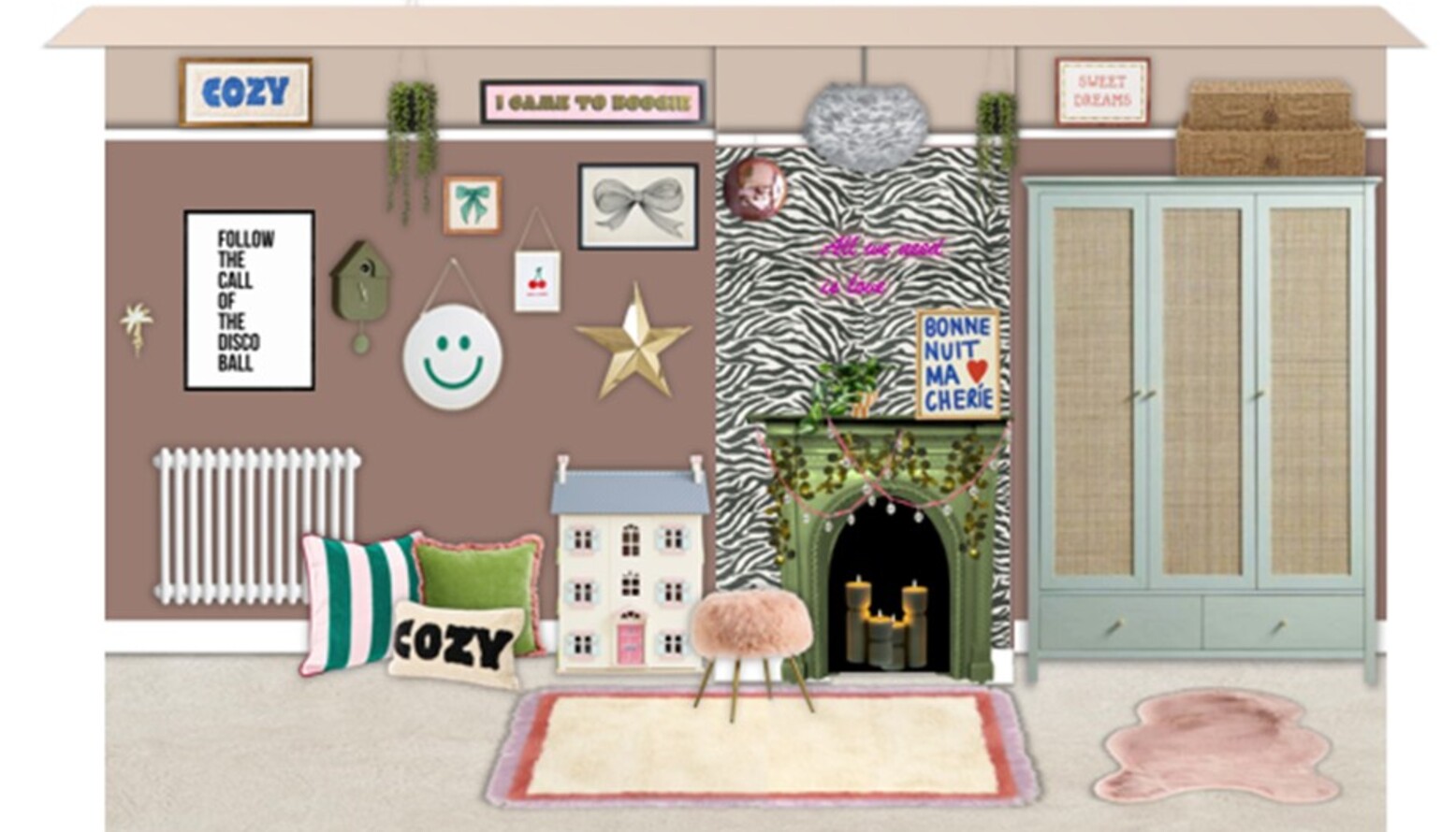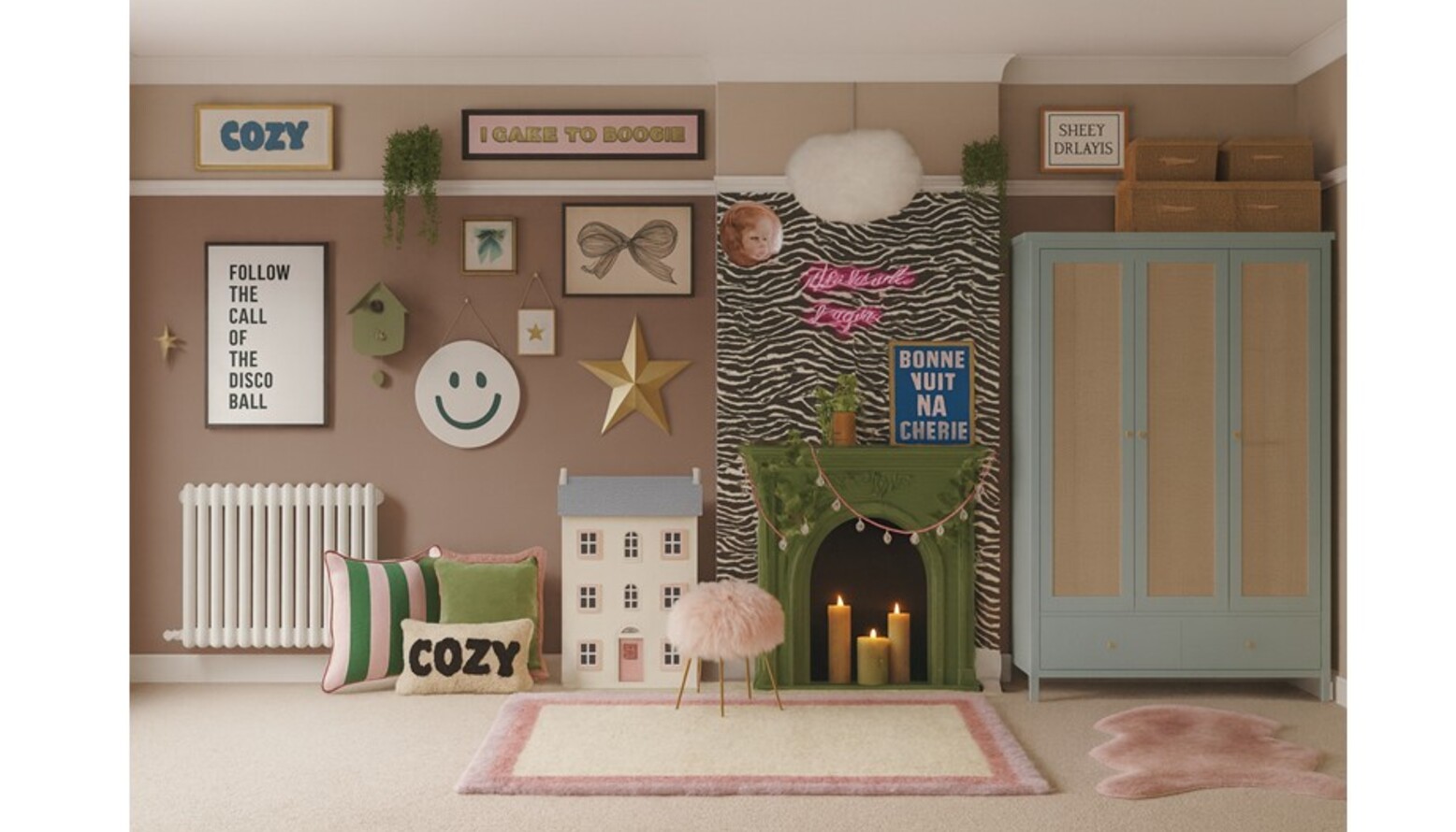 This charming children's bedroom features a delightful mix of playful and cozy elements. The walls are painted in a warm, soft tone that creates a welcoming atmosphere, accented by fun wall art and whimsical decor. A vibrant zebra wallpaper adds a bold touch, while various pieces of artwork, including framed phrases and a smiley face, bring personality to the space. A standout green fireplace serves as a unique focal point adorned with decorative elements and soft lighting. The flooring is covered with a plush rug in soft pastel colors, enhancing the room's comfort. A low fluffy stool adds a whimsical touch beside the fireplace. The furniture includes an inviting wardrobe in soft blue with woven panels, providing ample storage. Nesting baskets offer additional organization options. Pillows with cheerful designs and embroidery are scattered around, complemented by a lovely pink embroidered cushion cover and a cozy throw draped over the bed. Modern lighting fixtures, including a ceiling light and a quirky desk lamp, illuminate the room beautifully. The careful selection of decor creates an ambiance that is both cozy and vibrant, perfect for a child's imagination to flourish.