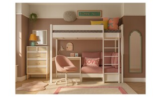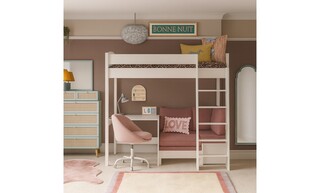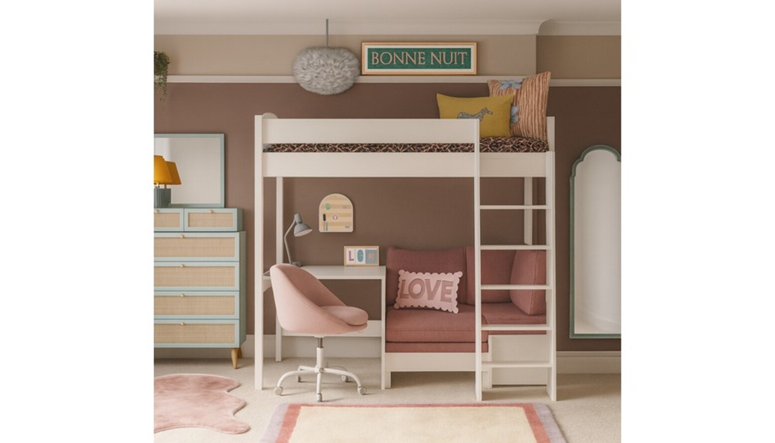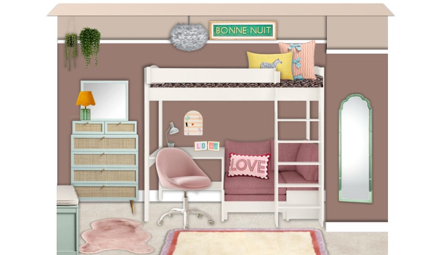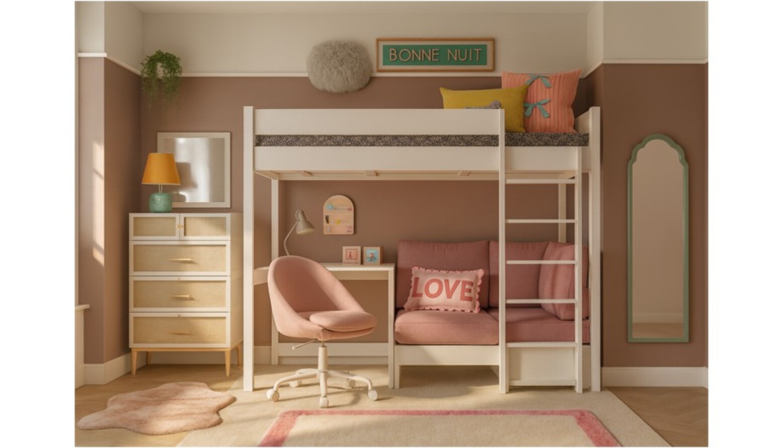 This charming children's bedroom features a delightful mix of playful and cozy elements. The walls are painted in a warm, soft tone that creates a welcoming atmosphere, accented by fun wall art and whimsical decor. A vibrant zebra wallpaper adds a bold touch, while various pieces of artwork, including framed phrases and a smiley face, bring personality to the space. A standout green fireplace serves as a unique focal point adorned with decorative elements and soft lighting. The flooring is covered with a plush rug in soft pastel colors, enhancing the room's comfort. A low fluffy stool adds a whimsical touch beside the fireplace. The furniture includes an inviting wardrobe in soft blue with woven panels, providing ample storage. Nesting baskets offer additional organization options. Pillows with cheerful designs and embroidery are scattered around, complemented by a lovely pink embroidered cushion cover and a cozy throw draped over the bed. Modern lighting fixtures, including a ceiling light and a quirky desk lamp, illuminate the room beautifully. The careful selection of decor creates an ambiance that is both cozy and vibrant, perfect for a child's imagination to flourish.