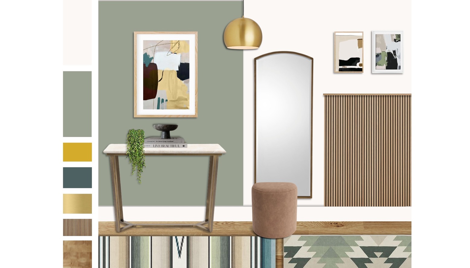 Stylishly placed wall hooks in a grey finish offer practical functionality while contributing to the contemporary charm. The color palette includes soft greens, warm neutrals, and accenting golds that create an inviting atmosphere. Faux plants and decorative vases enhance the natural feel without the maintenance of real plants.