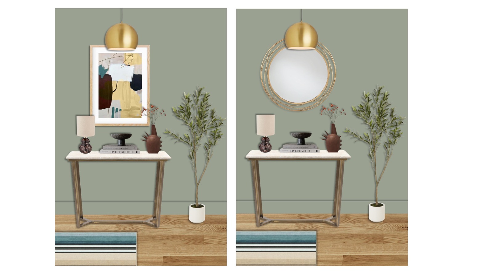 The entrance hall boasts a modern yet inviting aesthetic. A sleek, wall-mounted console table in a light finish welcomes visitors, adorned with a small potted plant and an art book, adding a touch of greenery and personalization. Behind it, an abstract art piece featuring ochre tones brings warmth and creativity to the space.