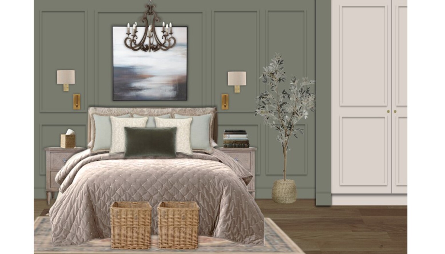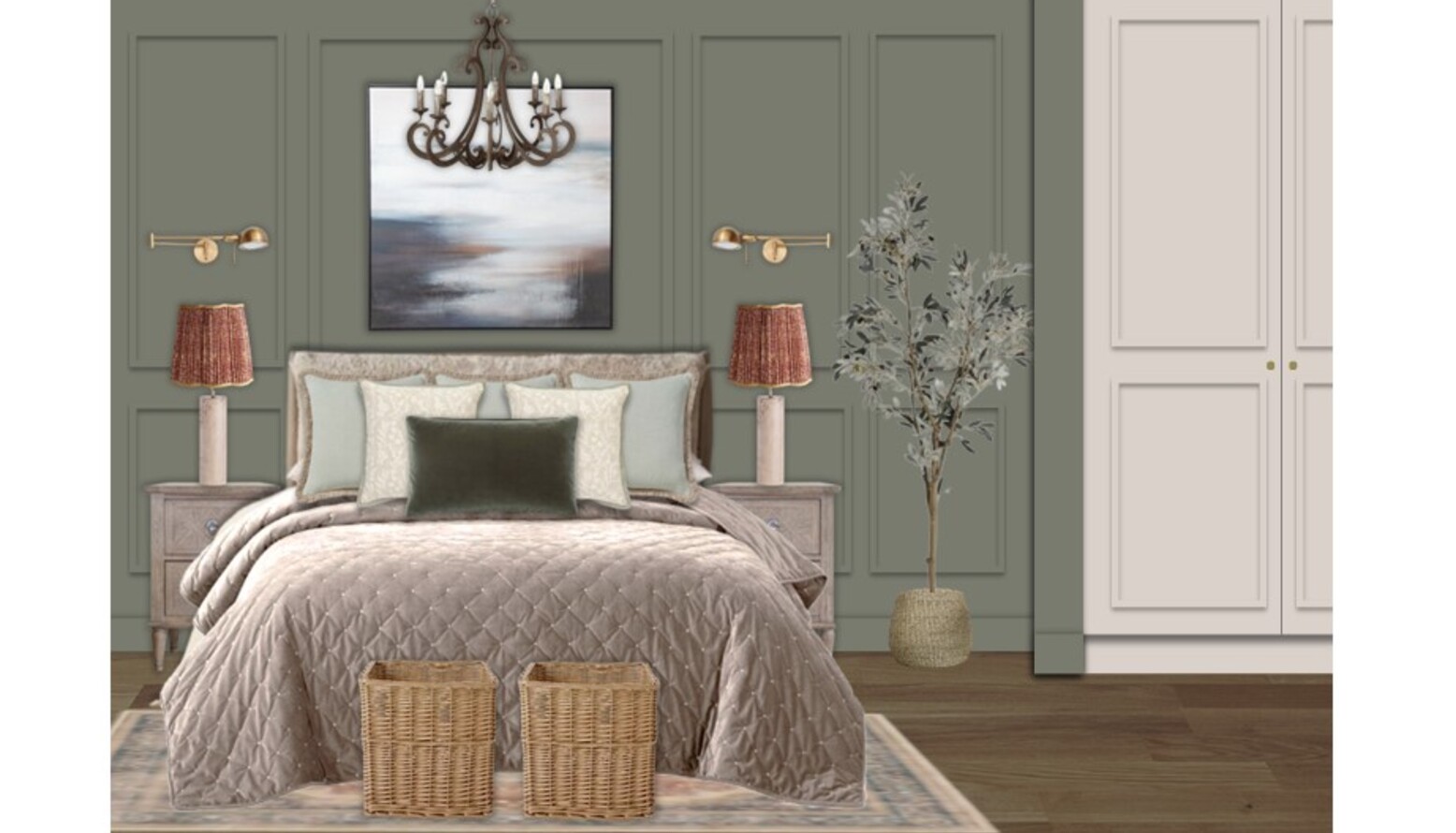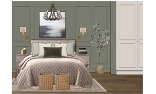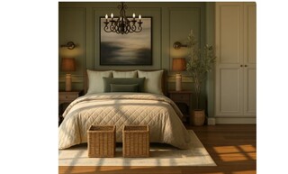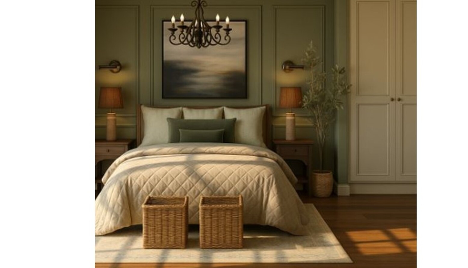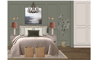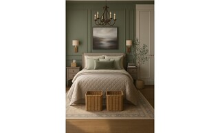 The bedroom features a harmonious blend of elegant design and comfort, showcasing a calming color palette with soft green walls that create a serene atmosphere. The focal point is a plush quilted bedspread draped over a beautifully styled bed, adorned with cushions in varying shades of green, providing a cozy yet sophisticated look.