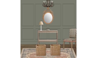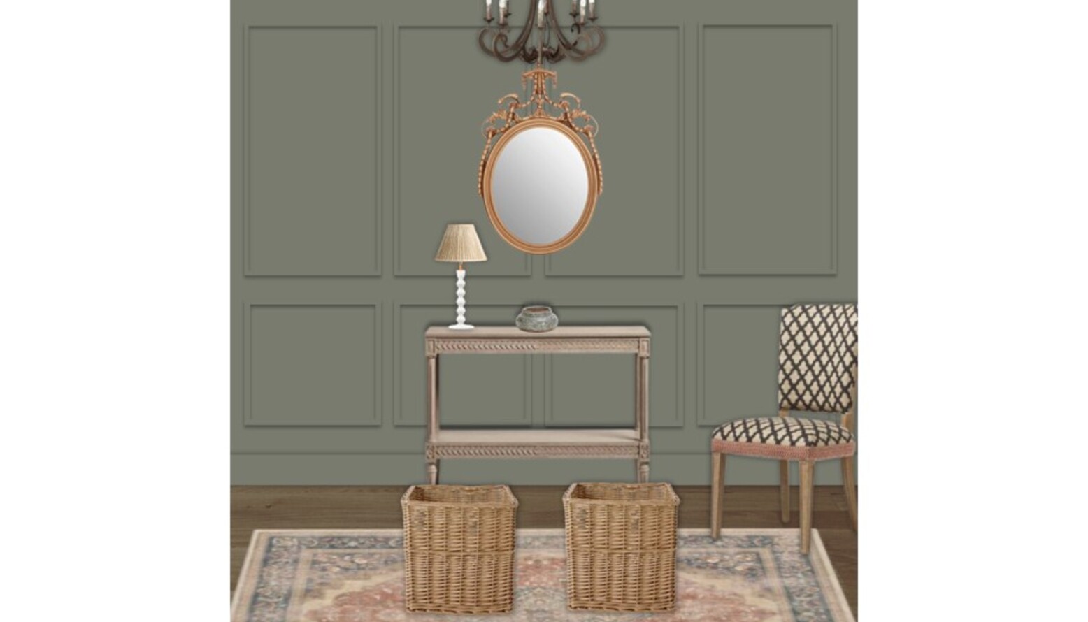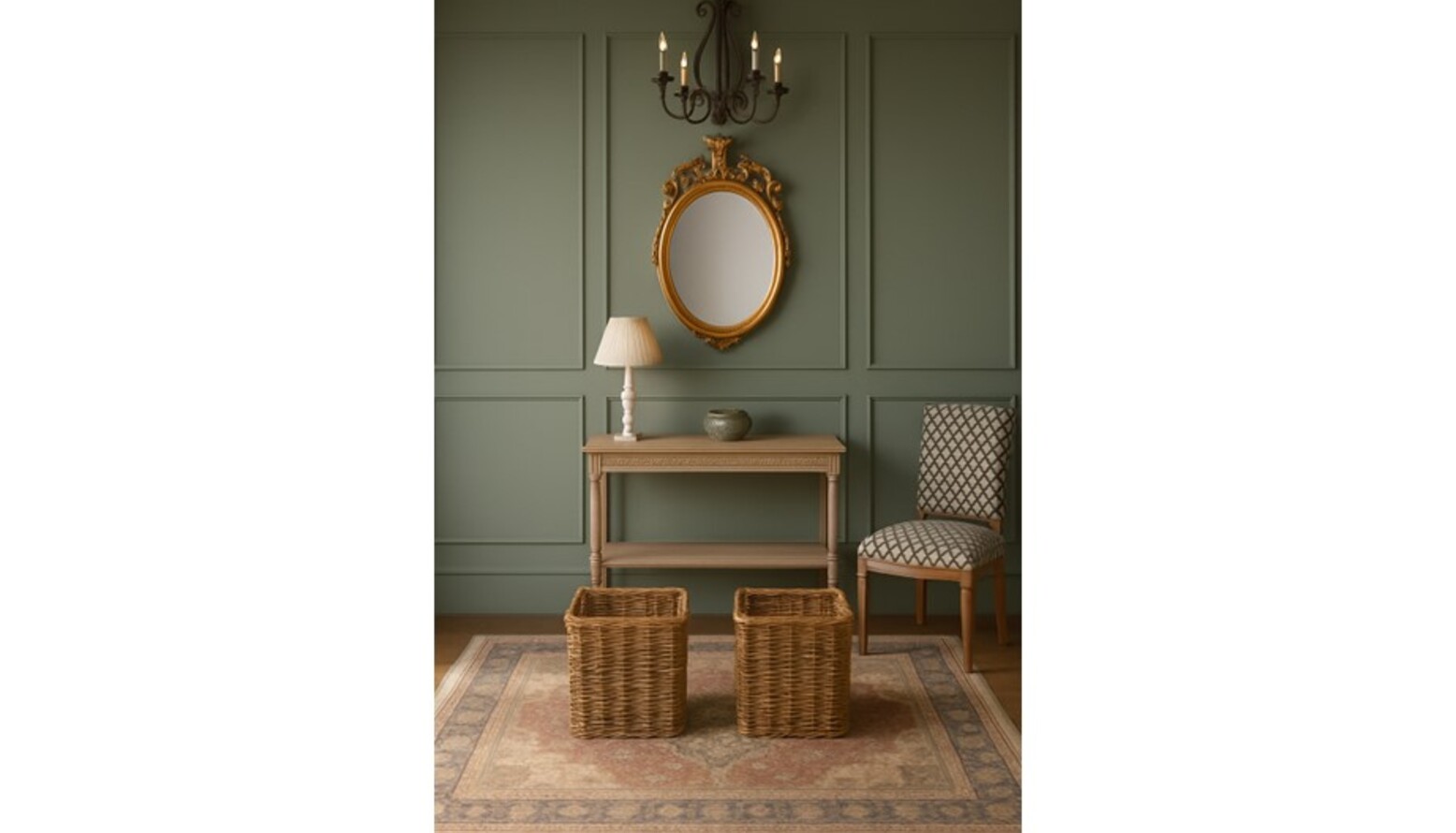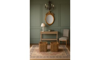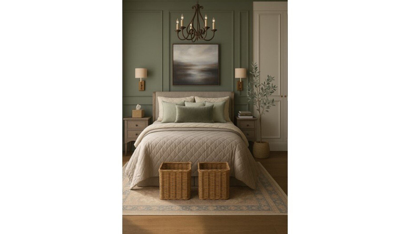 The flooring is enhanced by an Adeline Antique Red Flatwoven Rug, which adds texture and comfort underfoot. Complementary elements include decorative wicker storage baskets at the foot of the bed, cleverly merging style and functionality.
