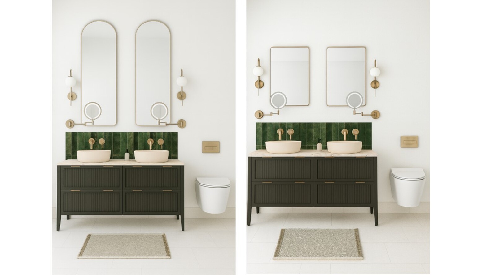 This main bedroom ensuite features a sophisticated and modern design, emphasizing both elegance and functionality. The dark-hued, ribbed vanity cabinet provides ample storage while adding texture to the space. Above the dual vessel sinks, strikingly oval mirrors create a sense of symmetry, flanked by stylish wall-mounted lighting in brushed brass, enhancing the warm ambiance.