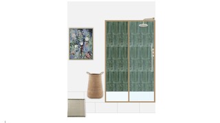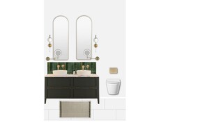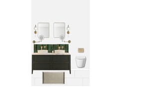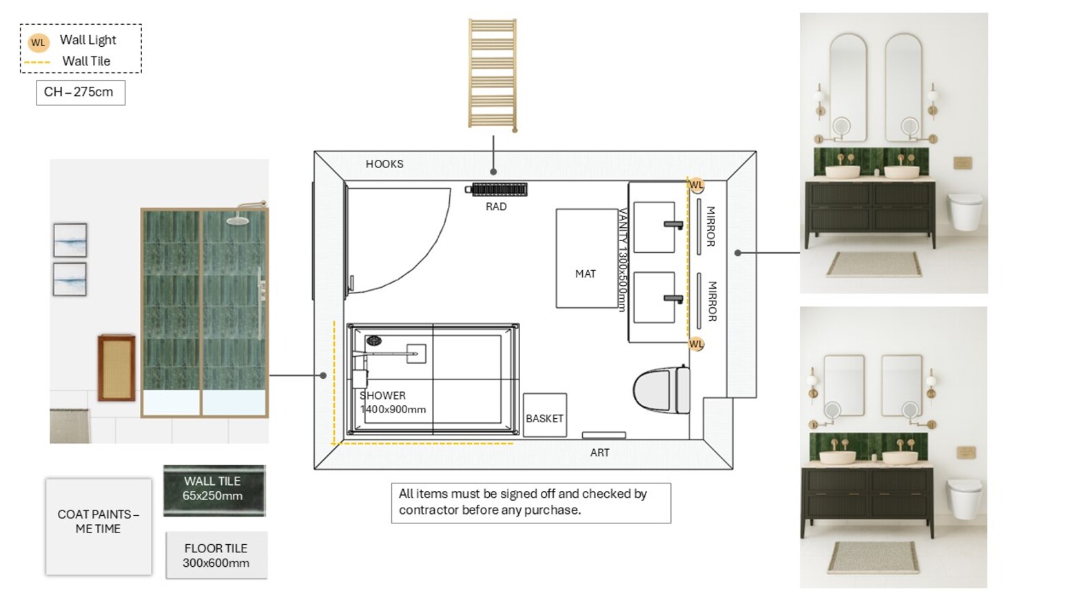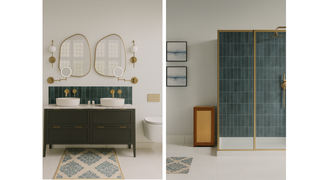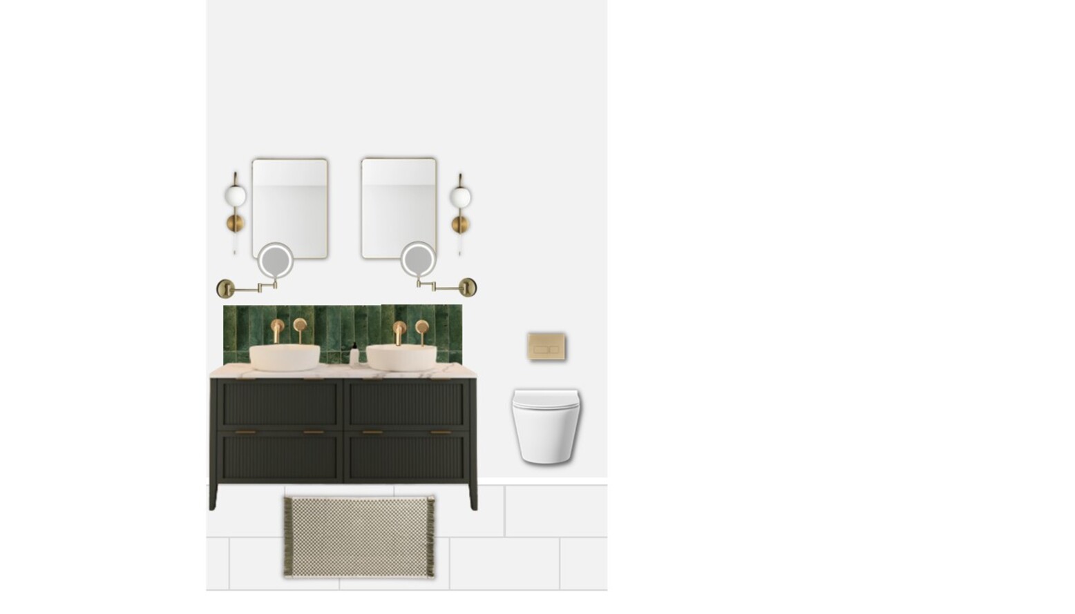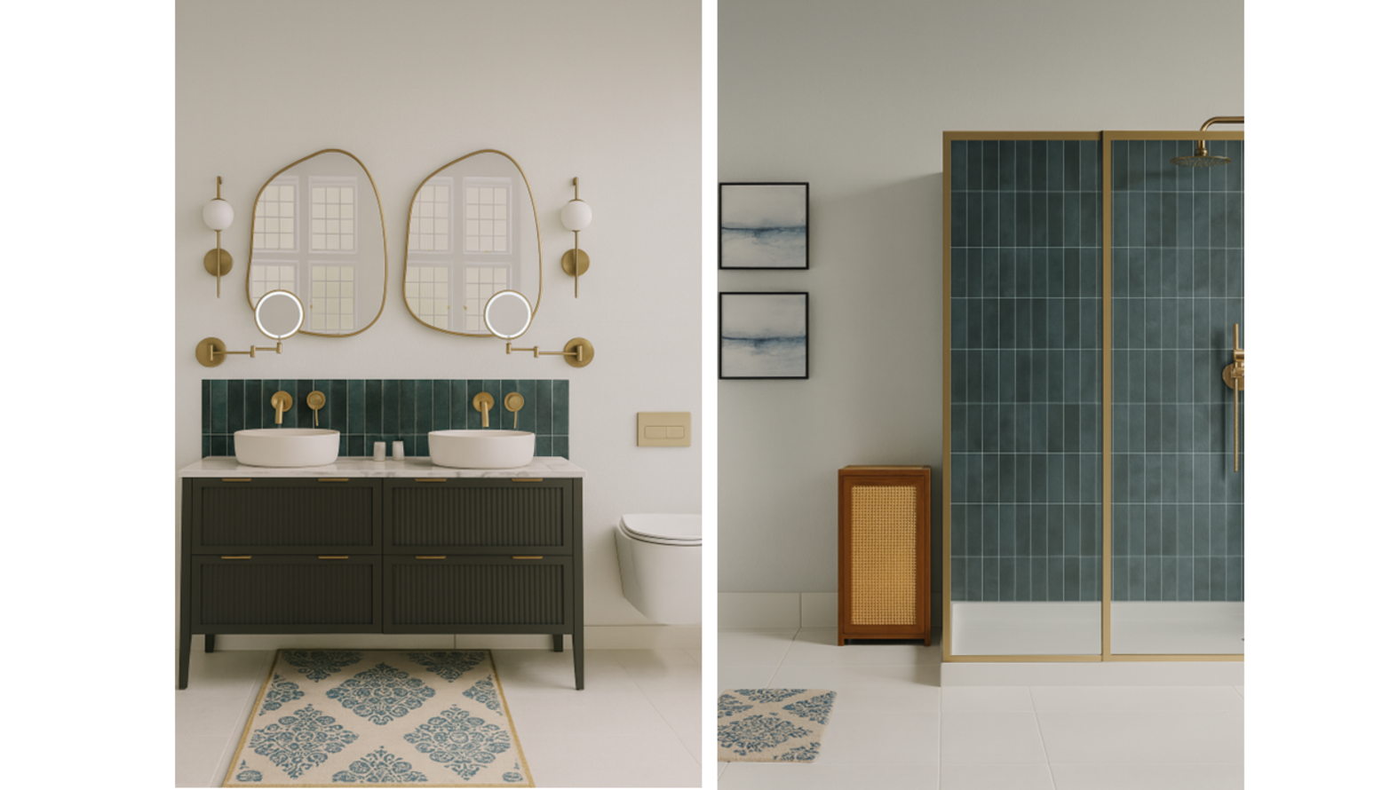 The thoughtful placement of a heated towel rail adds a touch of luxury, while decorative elements such as a plush bath mat in avocado and framed artwork contribute to the room's character. Each fitting, from the basin mixer taps to the mirror, is chosen for its cohesive brushed brass finish, elevating the design further.