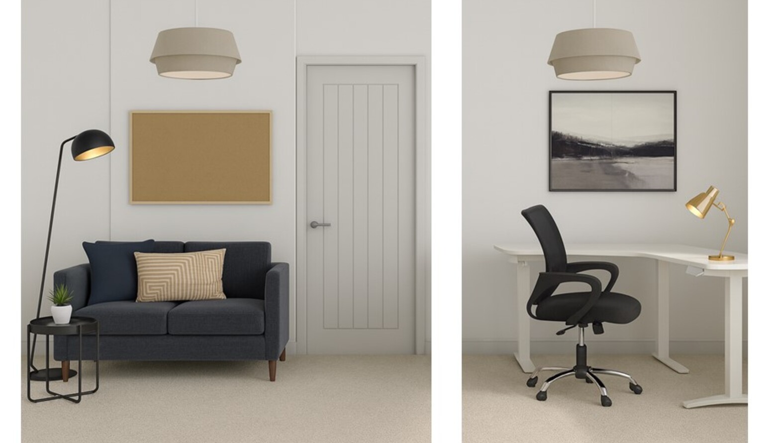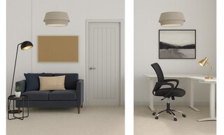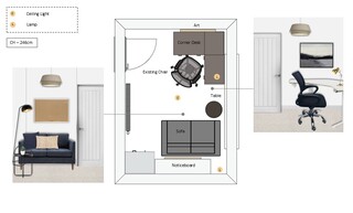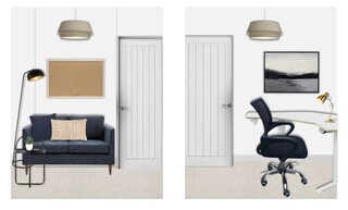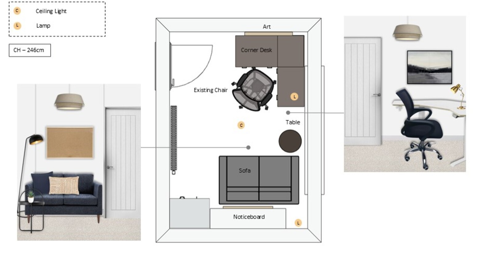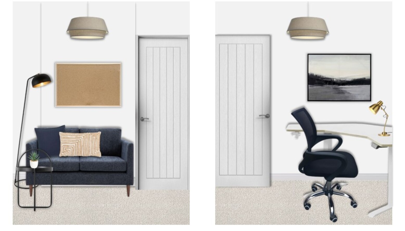 On the opposite side, a sleek white desk serves as the centerpiece for the workspace. Paired with an ergonomic black office chair, the setup is designed for comfort during long working hours. A John Lewis desk lamp in metallic brass complements the desk and enhances the overall design with a modern touch.