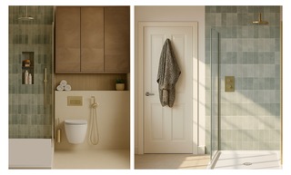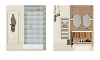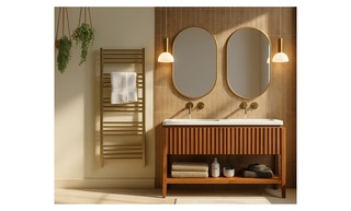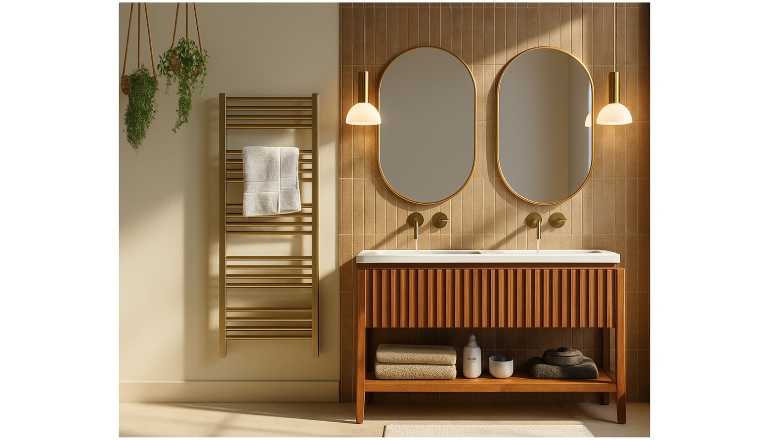 Marta's bathroom features a harmonious blend of modern aesthetics and functional design. The wall is adorned with warm, textured tiles, creating an inviting backdrop. Two oval mirrors framed in brushed brass reflect the soft, ambient light from stylish wall-mounted sconces. A sleek vanity unit in natural wood incorporates vertical slats, providing a touch of elegance while offering practical storage. Beneath the sink, neatly stacked towels and essential toiletries are within easy reach.
