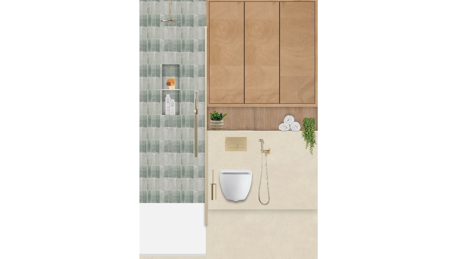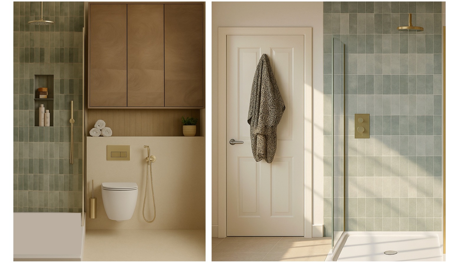 Brass fittings, such as the basin mixer tap and flush plate, tie together the décor, ensuring consistency throughout. The overall layout of the room maximizes both space and functionality, making it not only a retreat but also a practical area for daily routines.