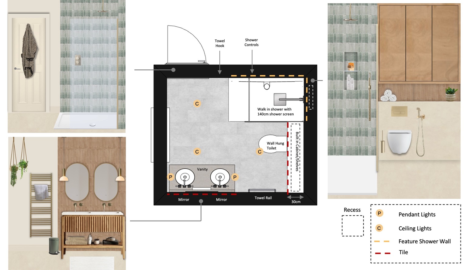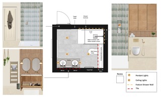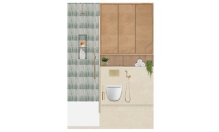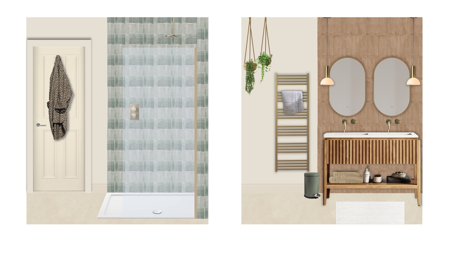 A brushed brass heated towel rail stands prominently, adding both luxury and warmth to the space. In the shower area, a transparent glass screen enhances the openness, while a rainfall shower head and wall-mounted controls maintain the sophisticated theme. The thoughtful placement of greenery, through hanging plants, brings a refreshing natural element, enhancing the tranquil atmosphere.