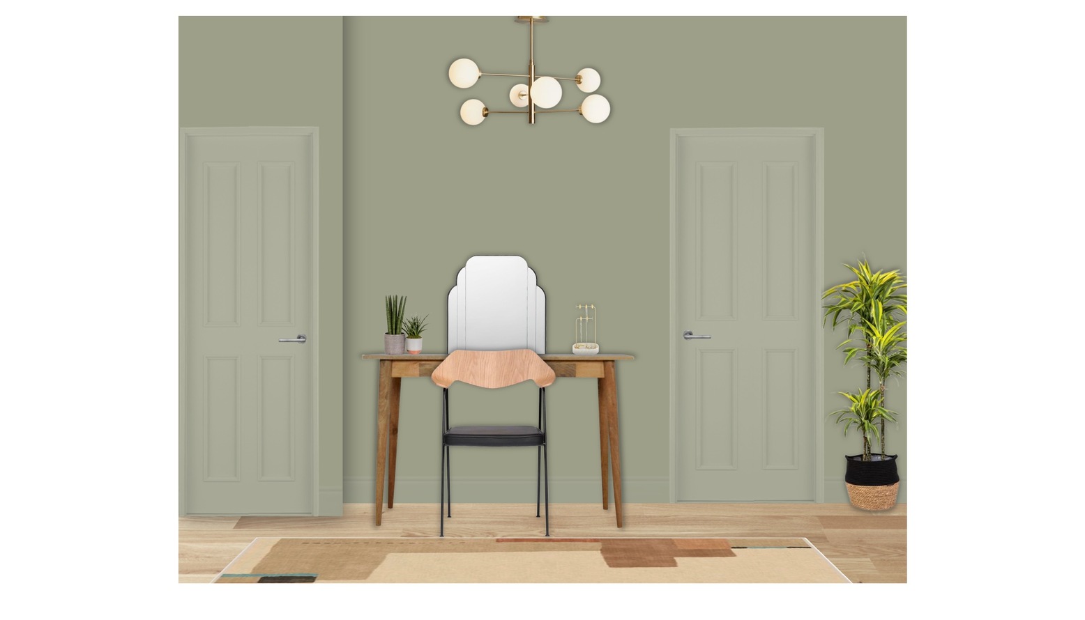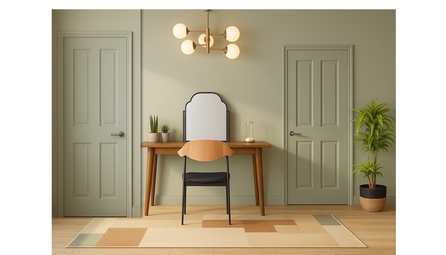 The ceiling light provides a stunning focal point with its elegant brass finish, while a clear table mirror adds practicality and style, reflecting the thoughtfully curated design elements throughout the room.