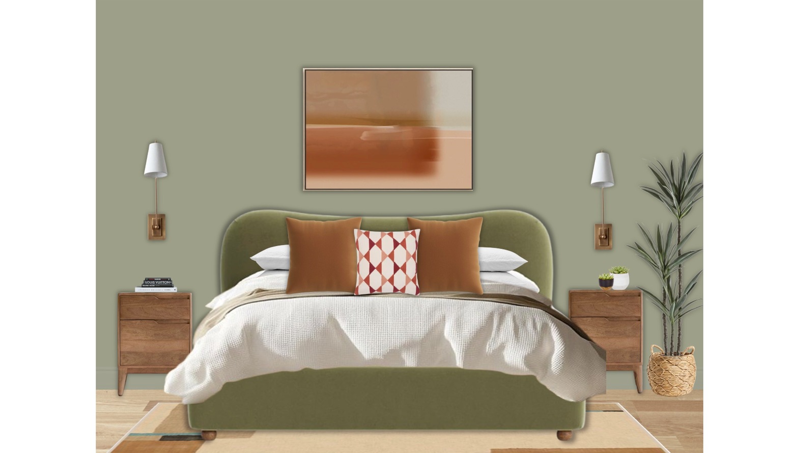 Two warm brass wall lights flank the bed, providing soft illumination, while a large artwork piece hangs above, blending hues of orange and earth tones, enhancing the room's warm ambiance.