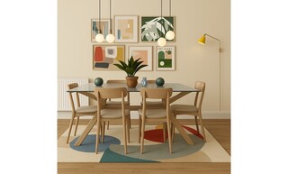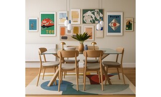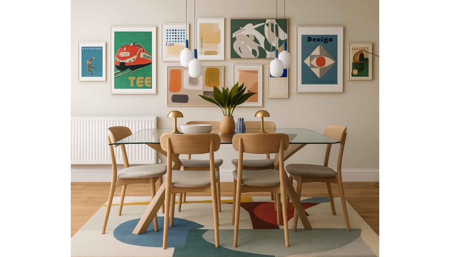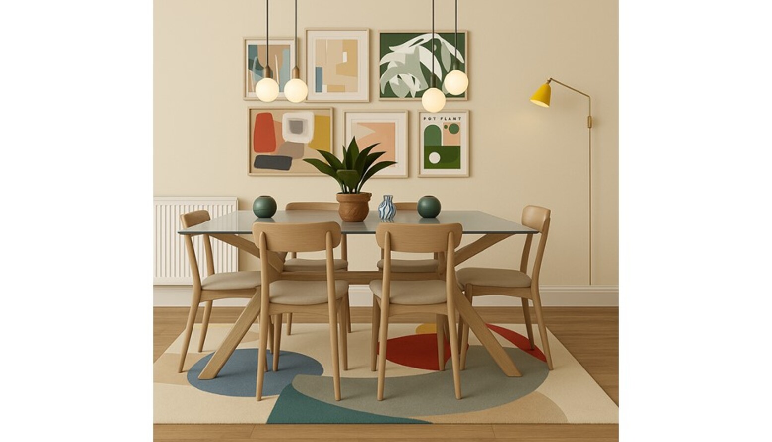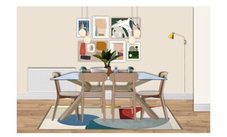 The floor is adorned with a bold area rug that brings together the room's colors, grounding the space while adding texture. The thoughtful selection of decor items, from the choice of art to the luxurious table lamp, encapsulates a perfect blend of modern design and personal touches, making the dining room a delightful retreat for meals and gatherings.